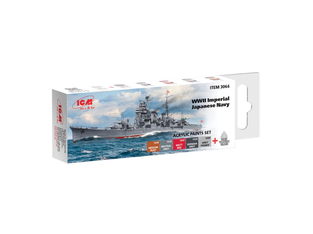 Sada 6 modelárskych akrylových farieb značky ICM určená pre nafarbenie alebo nastriekanie modelov lodí japonského námorníctva z druhej svetovej vojny.