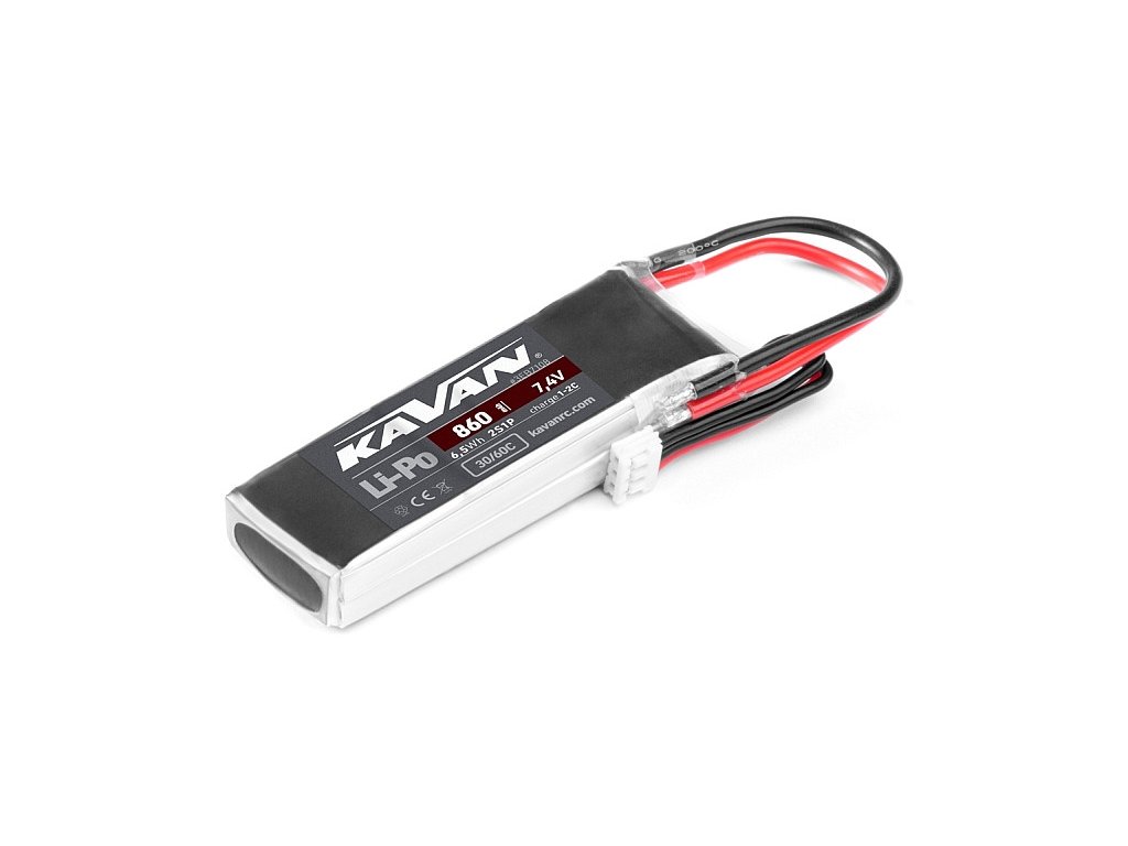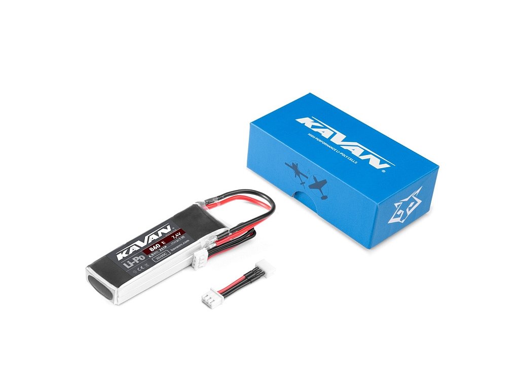 LiPo akumulátorová sada KAVAN s nabíjaním do 2C a vybíjaním 30/60C. Dvojčlánok 2s1p 7,4 V 860 mAh, rozmery: 73x25x14mm, hmotnosť 44g, servisný konektor JST-XH.
