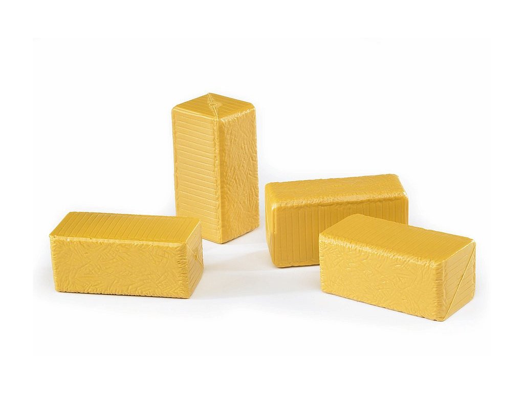 Sada štyroch zmenšených hranatých balíkov sena vhodná ako náklad kamiónov a vlečiek traktorov na diaľkové ovládanie, alebo modelov Bruder.