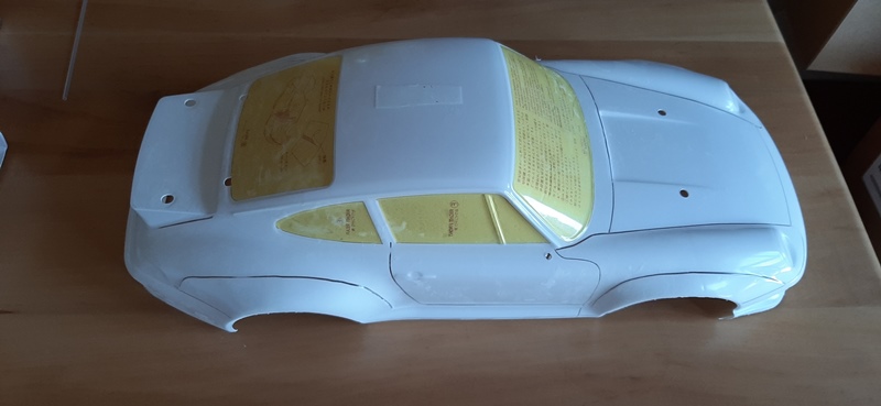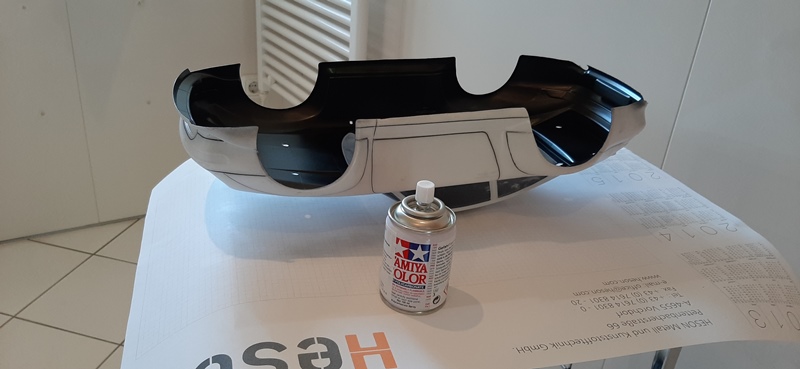 Karosériu som pred nastriekaním pripravil nalepením krycích masiek na okná z vnútornej strany. Boli obsiahnuté v stavebnici, stačilo ich vystrihnúť. Keďže som chcel zvýrazniť medzery medzi jednotlivými dielmi a vykrojeniami blatníkov čo je dobre vidieť aj na skutočnom aute, nalepil som z vnútornej strany aj tenkú maskovaciu pásku, ktorá zakryla predlisované linky. Pri striekaní karosérie som použil farby Tamiya na lexan. Najprv som naniesol bielu, odstránil masky liniek a potom nastriekal čiernu. Nakoniec som odstránil masky okien a nastriekal ich dymovou.