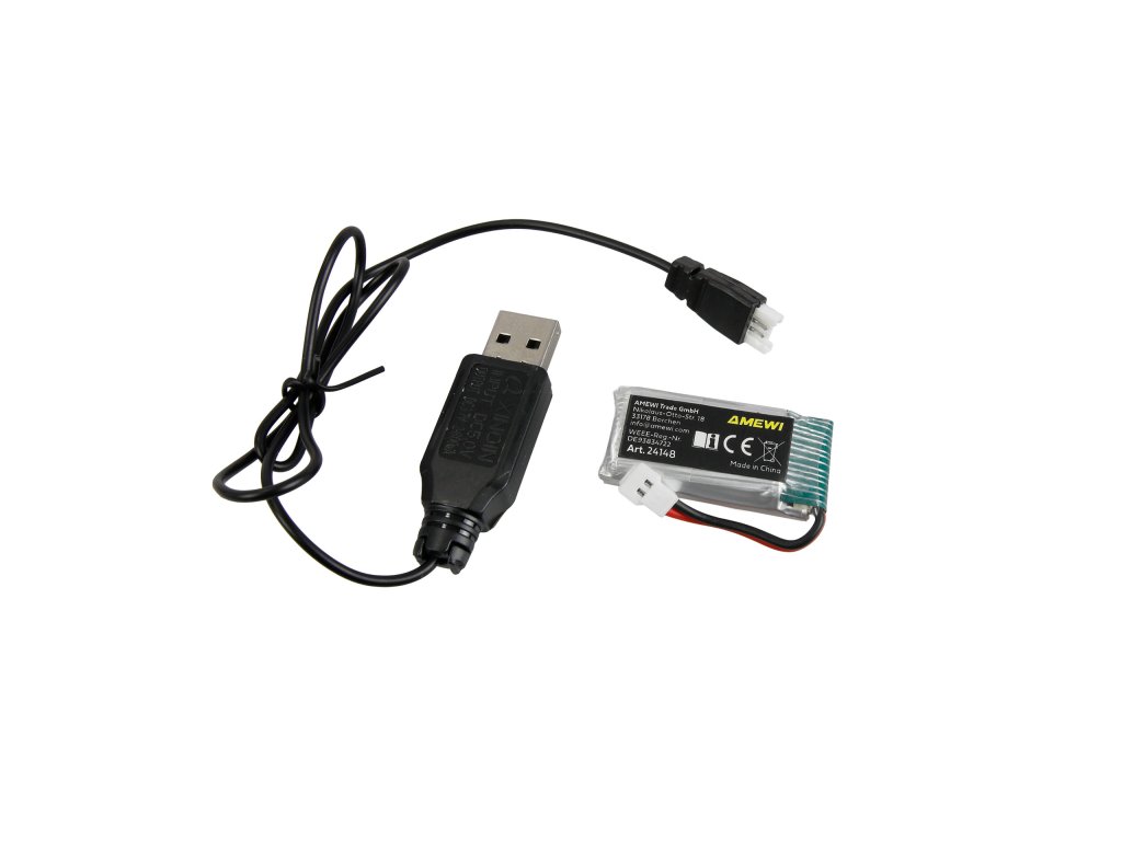 Obsah balení: Model, dálkové ovládání, nabíjecí baterie, nabíjecí kabel USB, nářadí, stojan, návod DE/EN