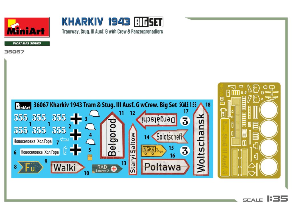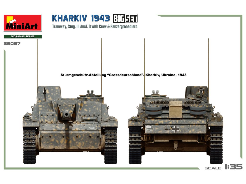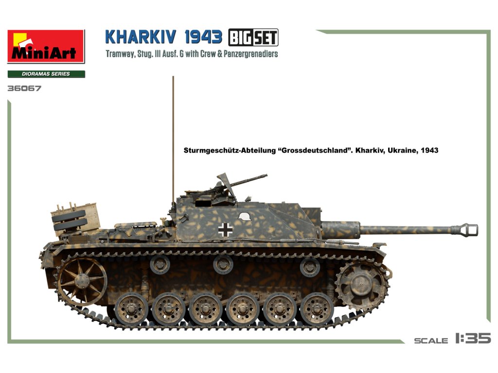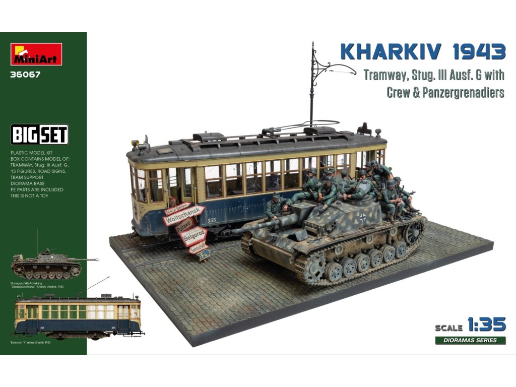 Stavebnice plastikového modelu diorámu Charkova z druhé světové války. Stavebnice obsahuje tramvaj, StuG III Ausf. G, 13 figurek, dopravní značky a základnu diorámy.