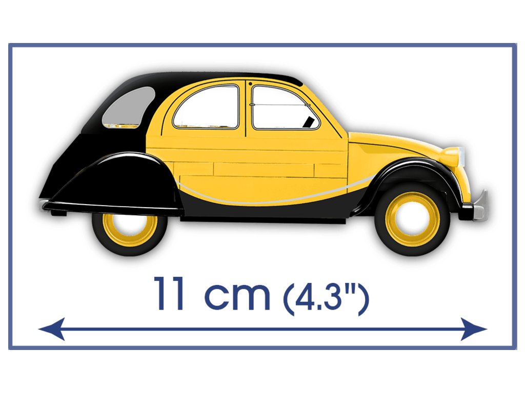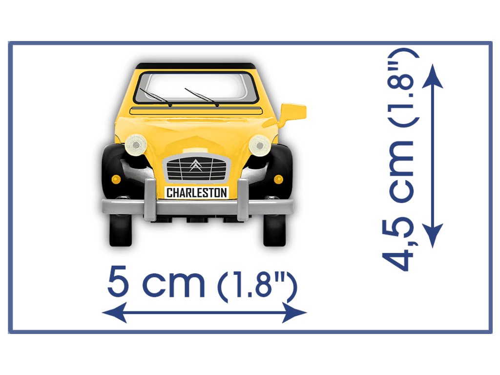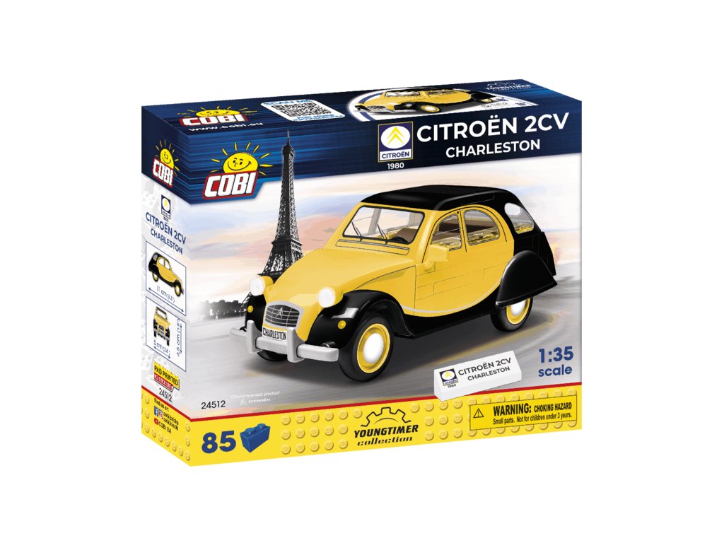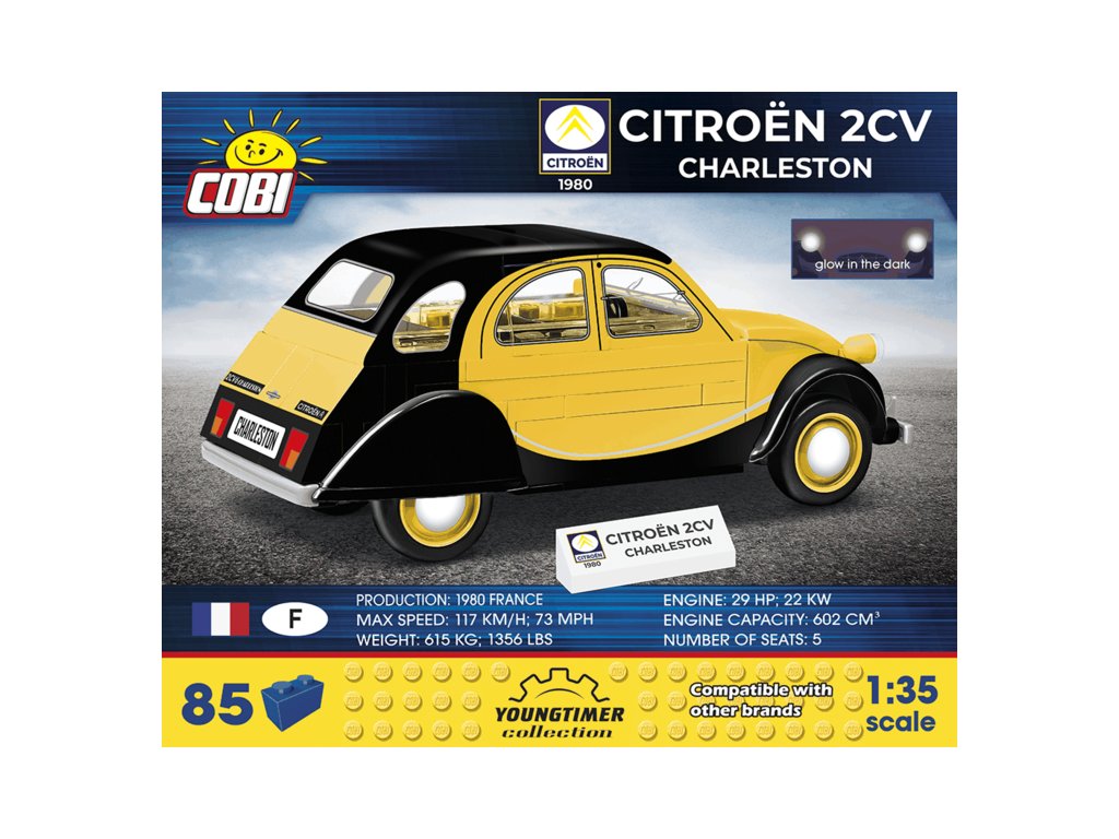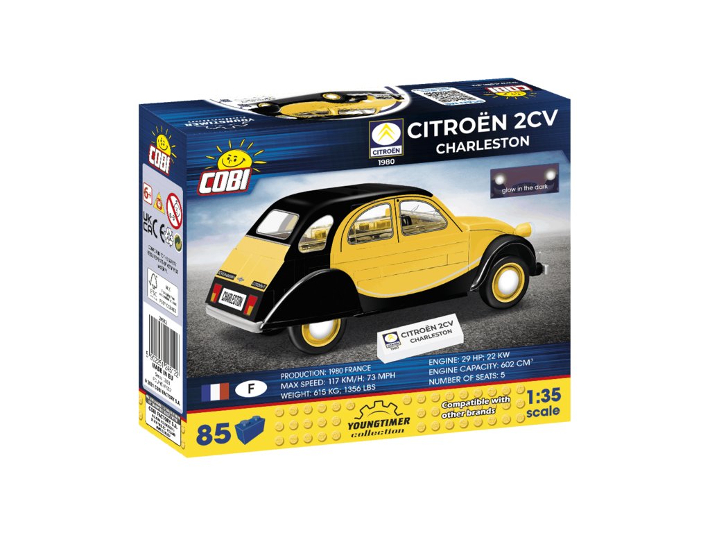 Stavebnice modelu z kostek legendárního francouzského vozu Citroën 2CV CHARLESTON z roku 1980. Autíčko je ve žluté a černé barvě. Přední světlomety svítí ve tmě a prosklení je vyrobeno z transparentního plastu.