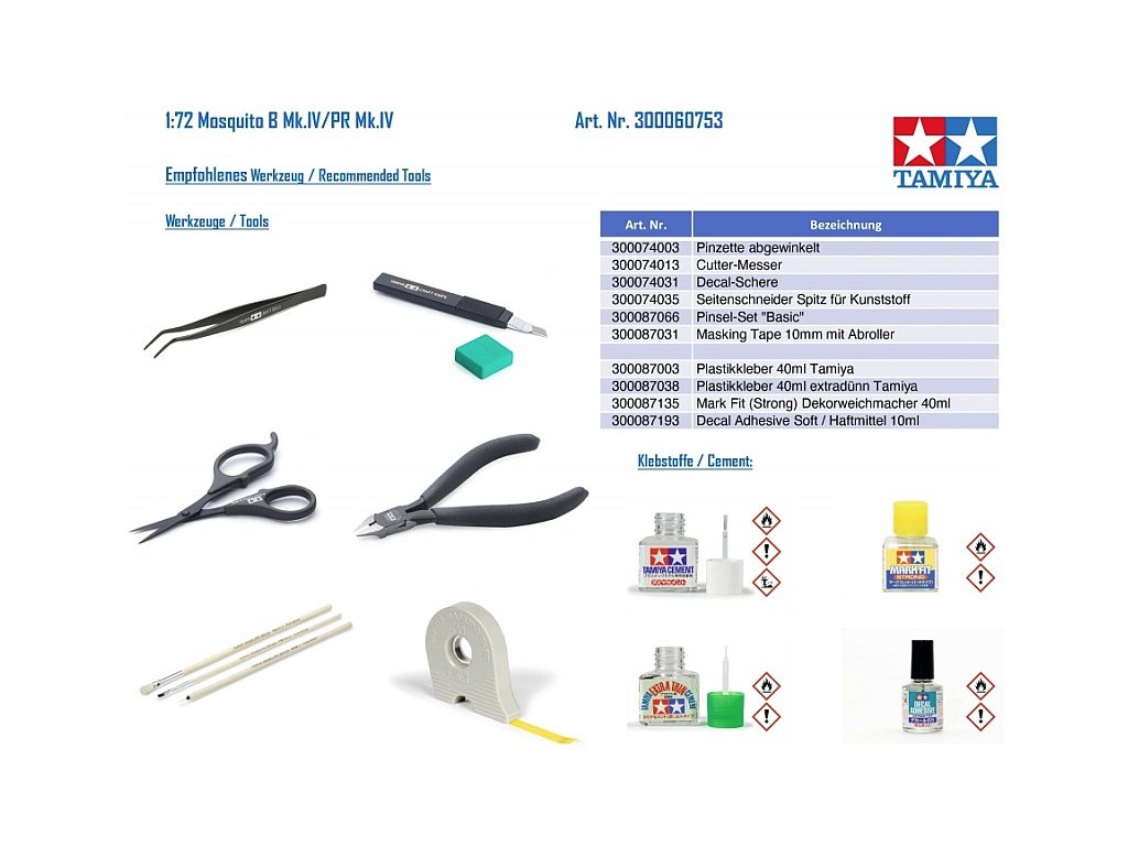 K sestavení modelu je třeba zakoupit: Lepidlo na plasty, barvy, štětce, modelářské nářadí. Dárkové sady / sady modelů mohou obsahovat také základní barvy, lepidlo a štětec.