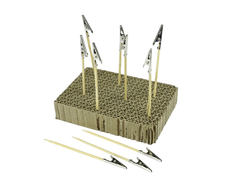 Lehký a odolný kartonový držák s 10 svorkami pro uchycení malých předmětů při stříkání stříkací pistolí nebo sprejem.