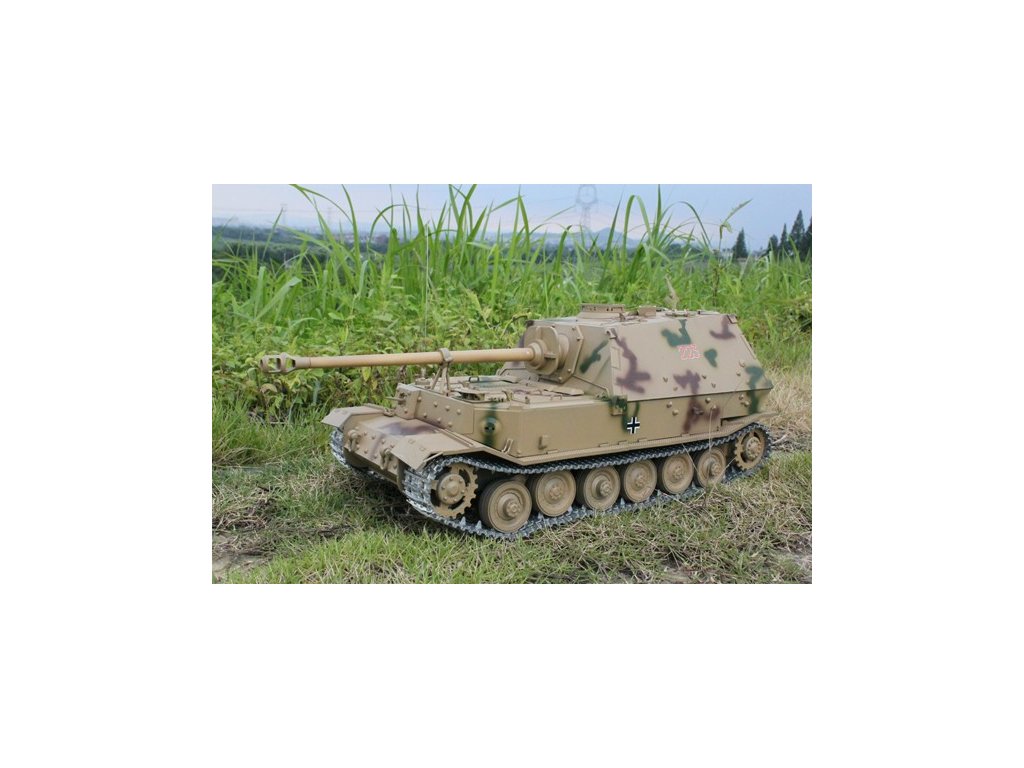Náš test Elephant: Tento povedený model jsem stavěl už dvakrát. Poprvé jsem si ho postavil pro vlastní potěšení (používám ho již několik let) a podruhé jsem stavěl pro zákazníka. Stavebnice je velmi kvalitní, i když má některé drobné nedokonalosti, které se ale vzhledem k atraktivnímu výsledku snadno odpouštějí. Všechny plastové díly jsou skoro bezvadně vymačkané, kovové části a spojovací materiál jsou přehledně uspořádány. Stavební návod je vcelku a přehledný a nebudete-li při stavbě spěchat, zvládnete stavbu bez větších problémů. Jen je třeba si trochu potrápit hlavu při sestavování mechanismů ovládání pohybu kanónu a zákluzu, které čínský konstruktér "modernizoval" během výroby a tak je původní návod v některých krocích nepoužitelný a je nahrazen skicí přiloženou na samostatném archu. Ten dodatek k návodu jako by kreslilo dítě na čínské základní škole. Ale to zkušený modelář zvládne. Všechny díly k sobě pěkně pasují a není třeba řešit žádné komplikace. Stavba se dá zvládnout za pár večerů. Jelikož ve stavebnici není multifunkční elektronika, modelář si může vybrat, zda postaví „tichý“ model, nebo zainvestuje do některého typu multifunkční jednotky. Já jsem zásadně za použití MFU Elmod Fusion PRO. Jednou jsem vyzkoušel i „originál“ Hooben MFU, což byla vlastně mutace Clark TK-22, ale za tu cenu co to stálo, to vůbec nestálo za nic. Jednoduše doporučuji Elmod, kdo mi uvěří, neprohloupí. Dále je třeba dokoupit RC soupravu a baterku (případně nabíječku). Já mám k tomuto tanku svůj oblíbený RC set Carson Reflex Car/Boat (6kanálový, jednoduchý) vysílač. Takže stačí jen do přijímače nastrkat kabely podle návodu, zkalibrovat systém a vše krásně hned funguje. Jelikož Elmod má krásnou kolekci zvuků, vyplatí se použít kvalitní reproduktor. Já jsem ho ve svém modelu umístil i do "bedničky", aby byl zvuk pěkně hluboký. Na můj Elephant jsem ještě doplnil pár drobných detailů jako jsou ocelová lana a podobně, a na závěr jsem ho mírně napatinoval. Jízdní vlastnosti odpovídají skutečnosti, je to pomalý model tak, jak má být. Na závěr však můžu tuto stavebnici jen doporučovat. Je to jednoduše zajímavý produkt.