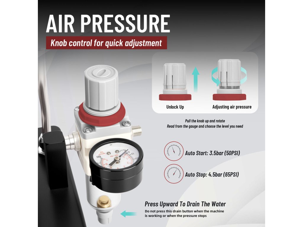 5. Tlaková nádoba má funkci tlumení vzduchových rázů, aby byl tlak a proud vzduchu přicházející do stříkací pistole co nejrovnoměrnější (to má výrazný vliv na kvalitu práce). Není tlaková nádoba, do které by kompresor naakumuloval velké množství vzduchu a poté se vypnul. Kompresor po zapnutí natlakuje do nádoby jen relativně malé množství vzduchu a po dosažení tlaku 4 bar se automaticky vypne. Pokud začnete ze vzdušníku odebírat vzduch, kompresor se po krátké chvíli sám zapne a průběžně doplňuje vzduch do vzdušníku.