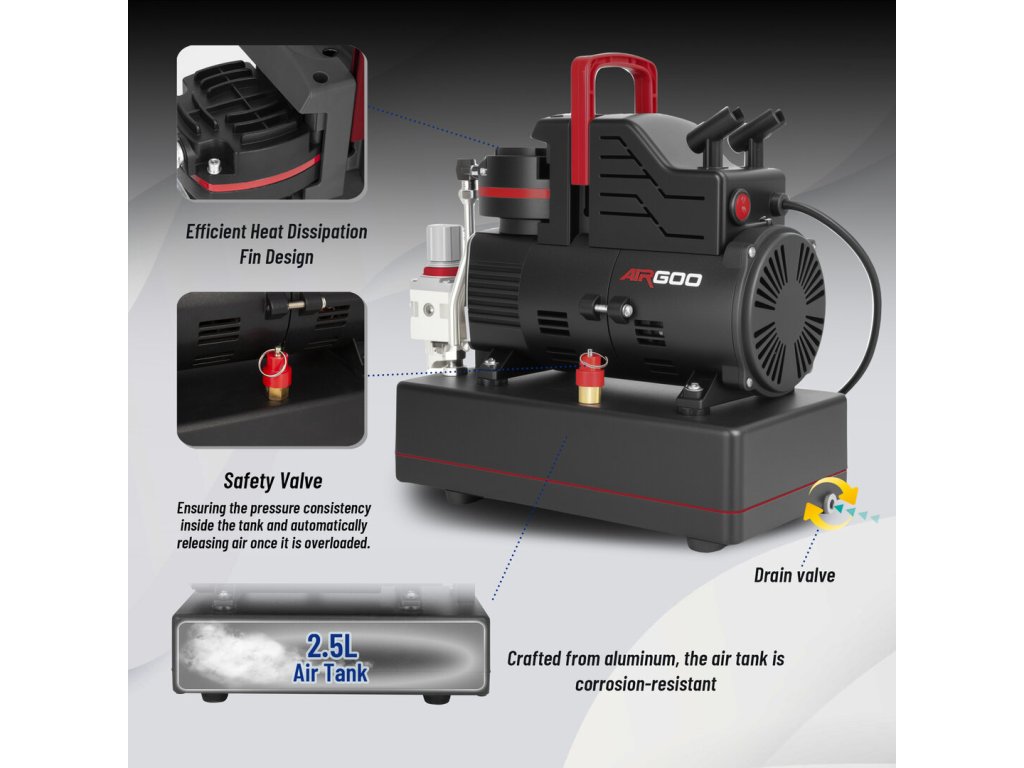 Pístový bezolejový kompresor. S tlakovou nádobou, regulátor výstupního tlaku, který je vybaven filtrem a manometrem. Nízká hlučnost během provozu. Díky nízké hmotnosti je přenosný a vhodný pro domácí a hobby použití. Tento kompresor je vhodný pro airbrush s tryskami 0,2 až 1 mm. Obsahuje dvojité chladící ventilátory umožňují dlouhodobý nepřetržitý provoz.
