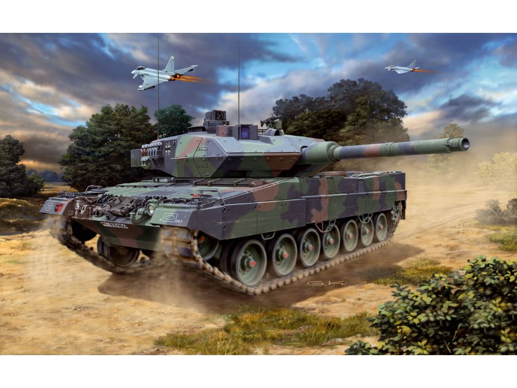 Stavebnice plastikového modelu moderního německého tanku. Stavebnice obsahuje lepidlo, štětec a základní odstíny barev.