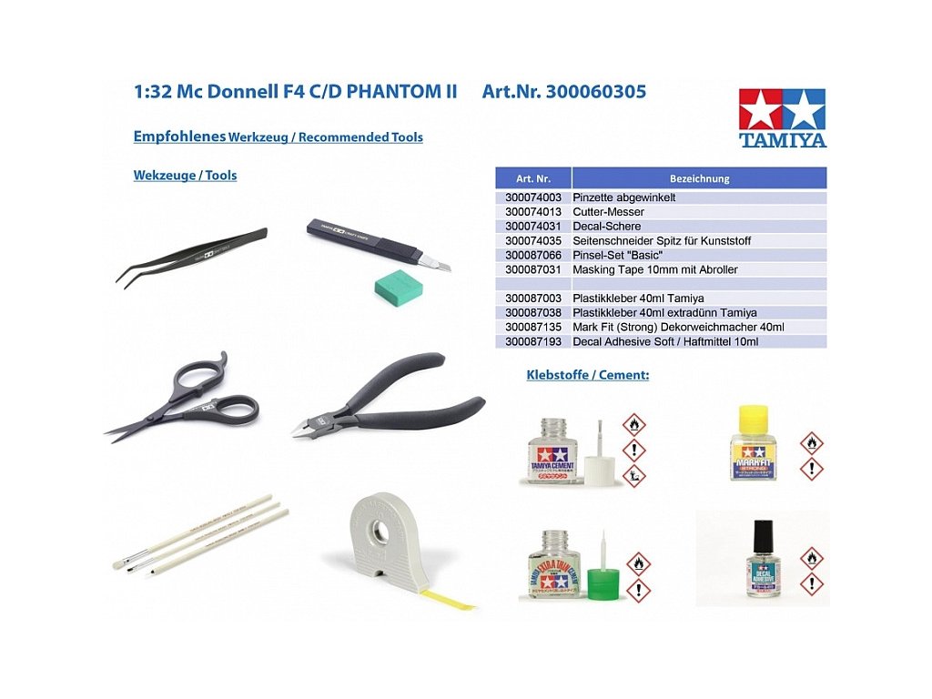 K sestavení modelu je třeba zakoupit: Lepidlo na plasty, barvy, štětce, modelářské nářadí. Dárkové sady / sady modelů mohou obsahovat také základní barvy, lepidlo a štětec.