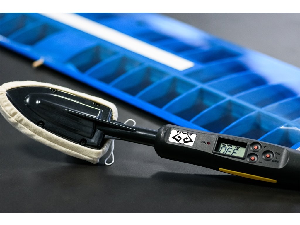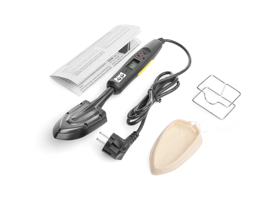 Profesionální modelářská potahovací žehlička s teflonem potaženým tělem, velmi přesnou elektronickou regulací teploty a digitálním zobrazením provozní teploty na LCD displeji.