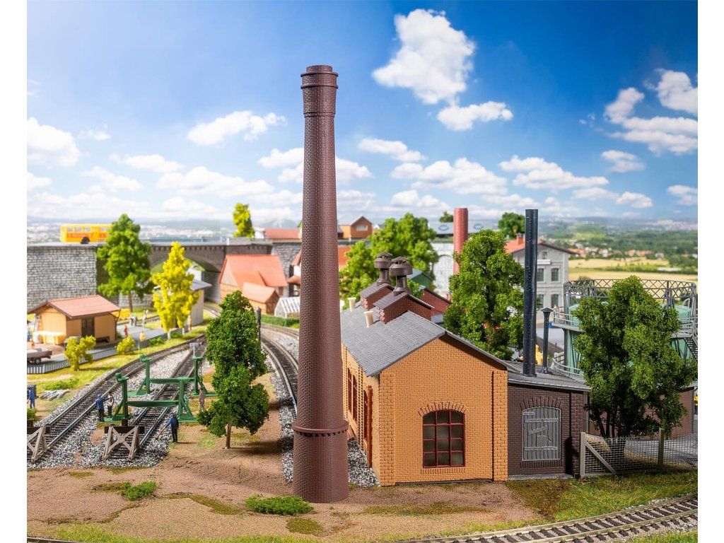 Stavebnice plastikového modelu průmyslového komína určeného do modelové železnice nebo diorámy.