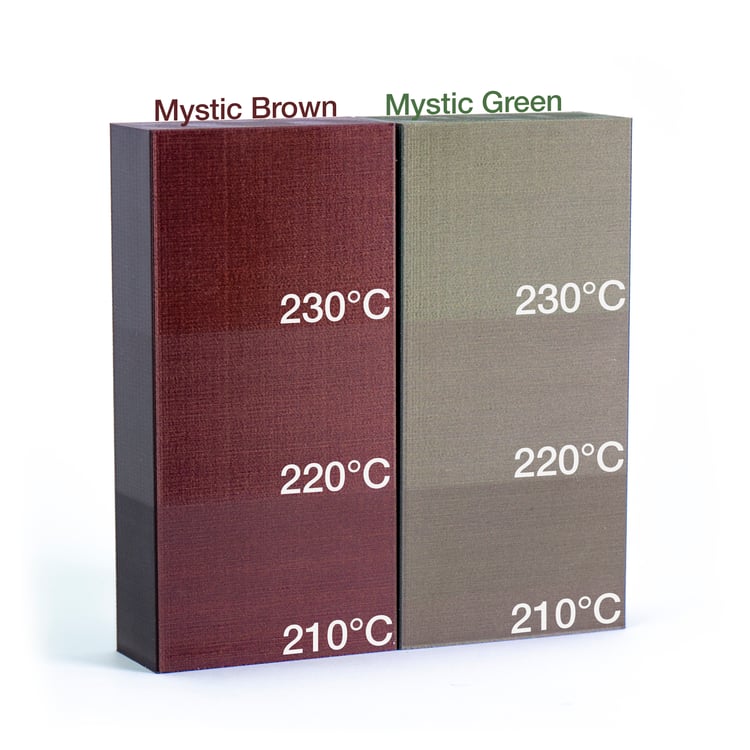 Optické vlastnosti filamentu se mění v závislosti na tiskové teplotě. Čím vyšší teplota trysky při tisku, tím lesklejší výsledný model bude.