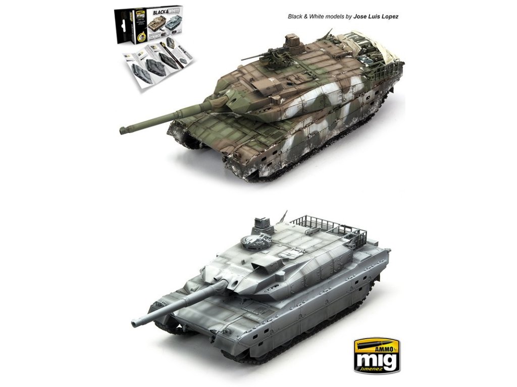Sada modelářských akrylových barev a jiných produktů značky Ammo určená pro nabarvení nebo nastříkání modelů pomocí techniky Black&White.