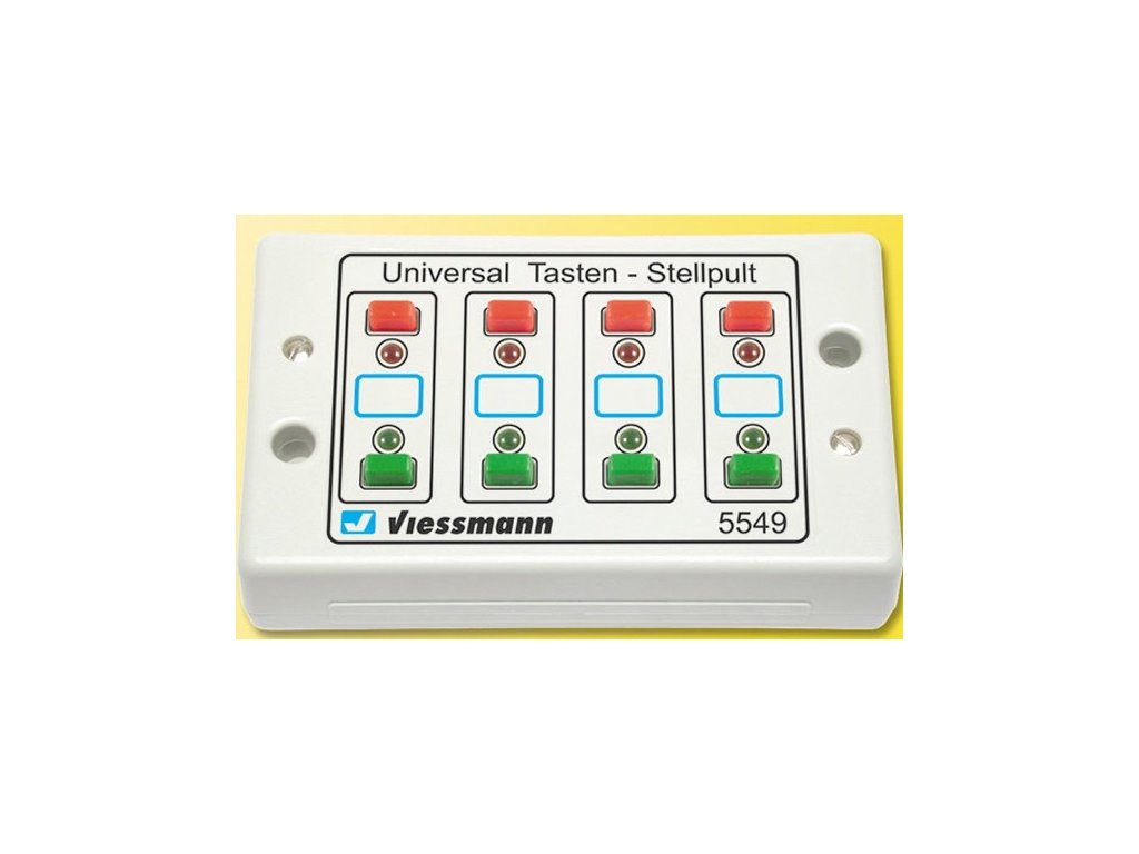 Univerzální ovládací panel s tlačítky a LED signalizací určený pro ovládání čtyř 2-polohových prvků s možností okamžité zpětné vazby, jako například návěstidla, výhybky, nebo univerzální relé Viessmann 5551. Skutečná zpětná vazba o poloze návěstidla, výhybky nebo relé je zobrazena.