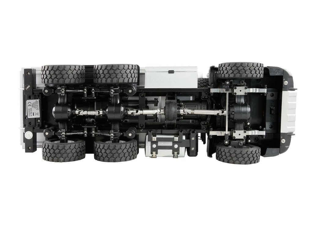 RC-Modell des Mercedes Arocs 6x6 Muldenkippers für die Fernsteuerung, geeignet für Anfänger und Fortgeschrittene. Das Modell besteht aus Metall und Kunststoff.