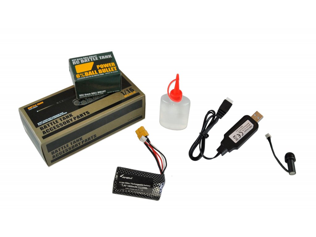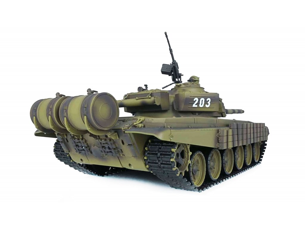 Ferngesteuertes russisches Kampfpanzermodell (RC-Modell), Komplettset mit Zubehör. Das Modell ist RTR (Ready to Use) und somit sofort nach dem Auspacken betriebsbereit. Es ist mit einem realistischen Fahrwerk mit funktionellen Raupen, Antriebs-, Fahr- und Spannrädern ausgestattet, die das Vorwärts-, Rückwärts- und Wenden ermöglichen. Die Getriebe sind mit Motoren der Größe 380 ausgestattet. Der Tank enthält eine Kanone für 6-mm-Kugeln. Die Steuerung erfolgt zyklisch durch Gedrückthalten des linken Steuerknüppels des Senders (Senken und Heben). Es verfügt über eine 2,4-GHz-Fernbedienung. Es ist mit einem Infrarot-Kampfsystem ausgestattet, das interaktive Kämpfe zwischen Fahrzeugen derselben Serie ermöglicht. Das Modell ist mit einem Soundmodul ausgestattet, das das Geräusch des Motors, die Geräusche des Abfeuerns eines Maschinengewehrs und einer Kanone imitiert. Ein Rauchgenerator ist ebenfalls installiert. Es enthält auch Metallteile. Die Lieferung des Modells erfolgt in einem hochwertigen Karton mit Aufdruck.
