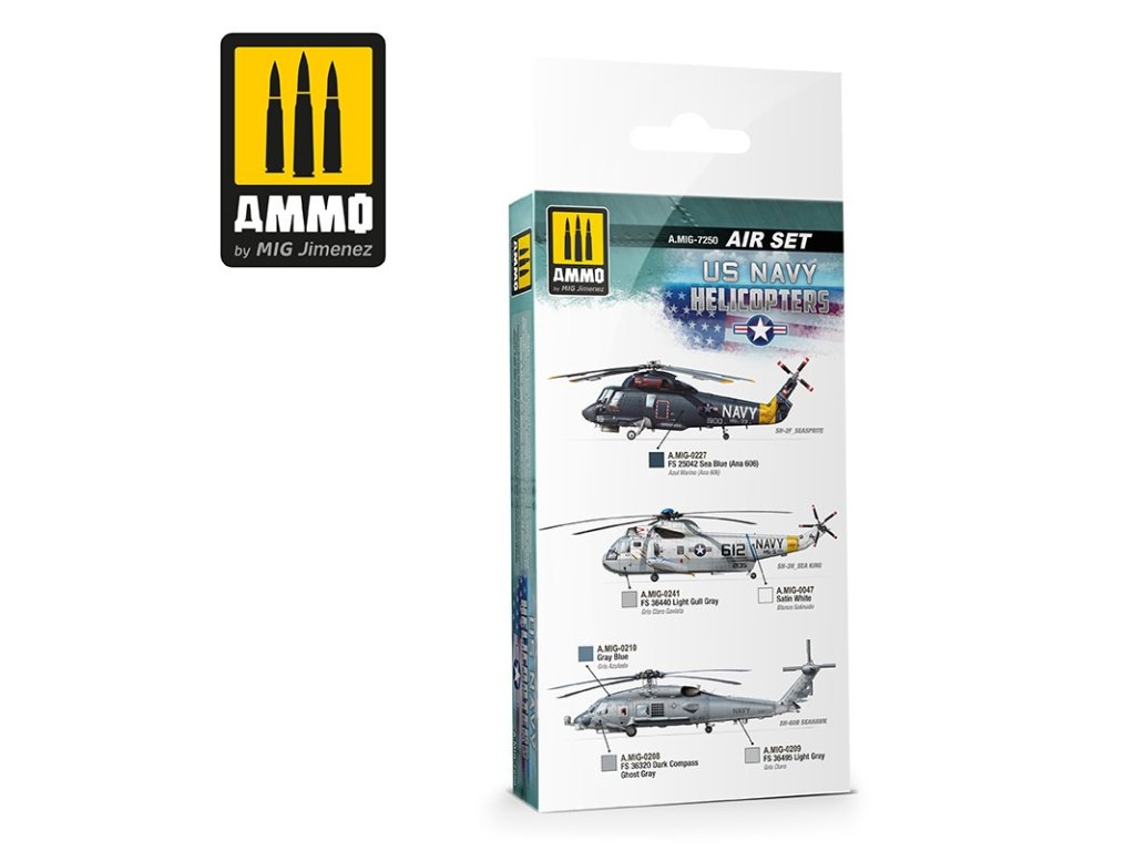Set mit Acryl-Modellfarben von Ammo, entwickelt zum Bemalen oder Sprühen von Hubschraubermodellen der US Navy vom Ende des Zweiten Weltkriegs bis heute.