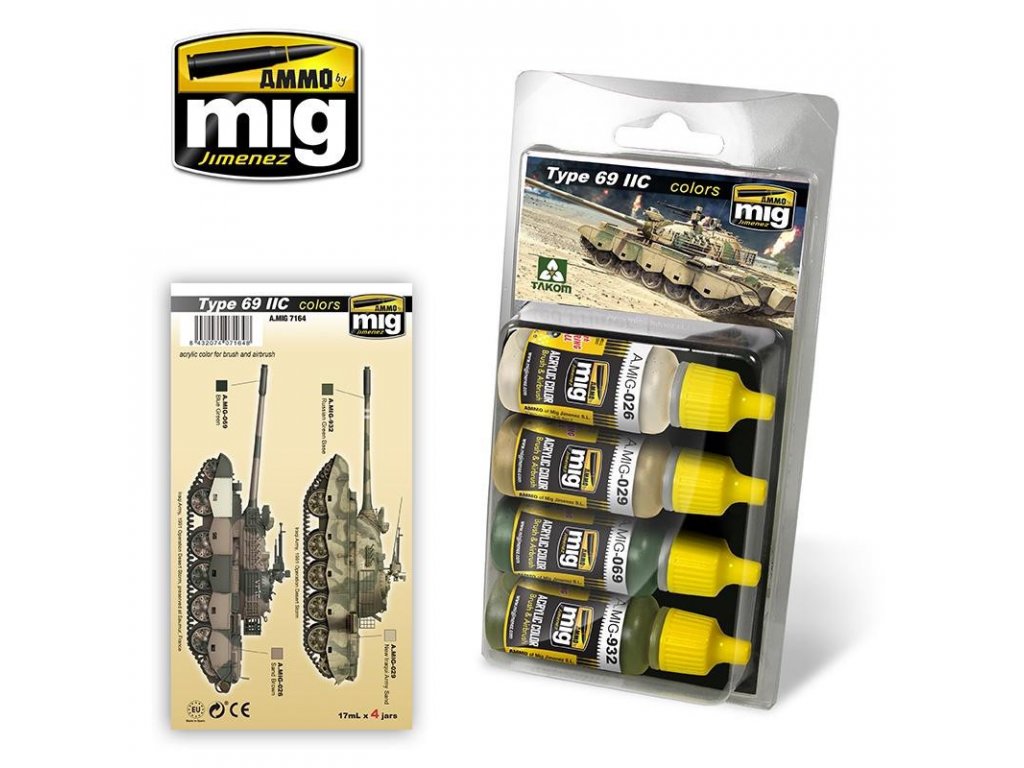 Set mit Acryl-Modellfarben von Ammo, entwickelt zum Bemalen oder Sprühen von Modellen des Panzers Typ 69 II der irakischen Armee.