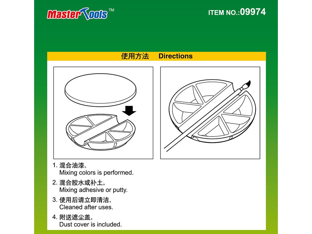 Sechs Mulden aus Kunststoff zum Mischen von Farben mit integriertem Pinselhalter. Jede Mulde fasst 2 ml. Eine Staubschutzhaube ist ebenfalls enthalten.