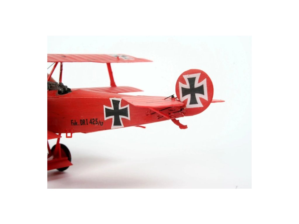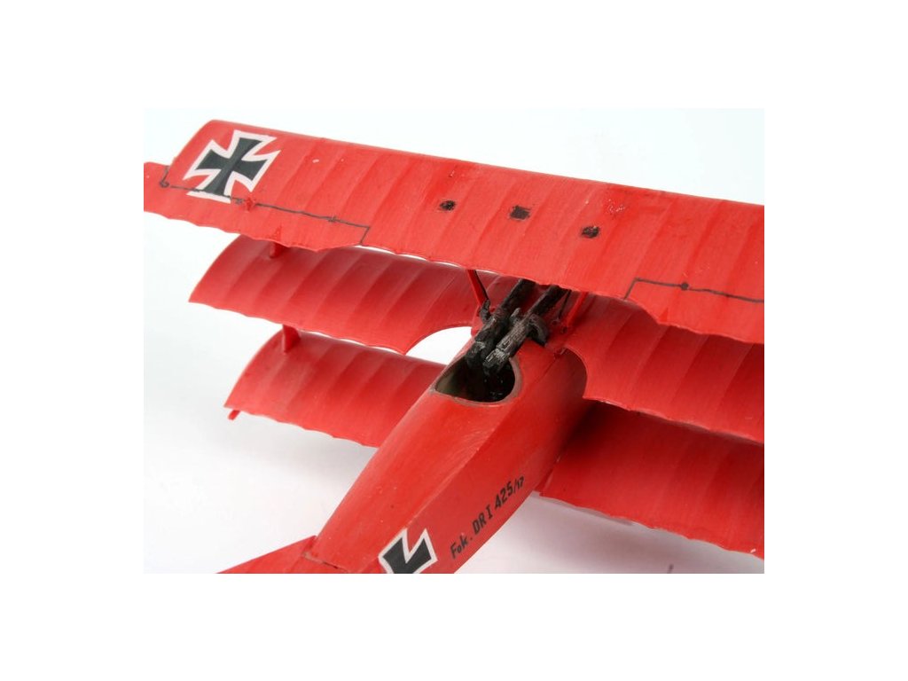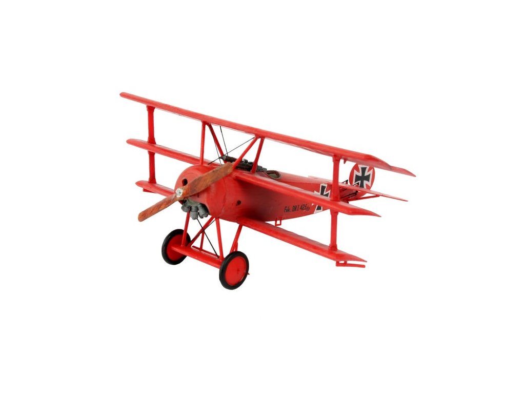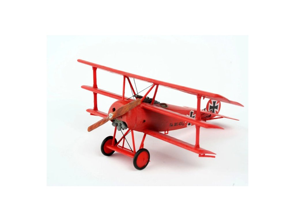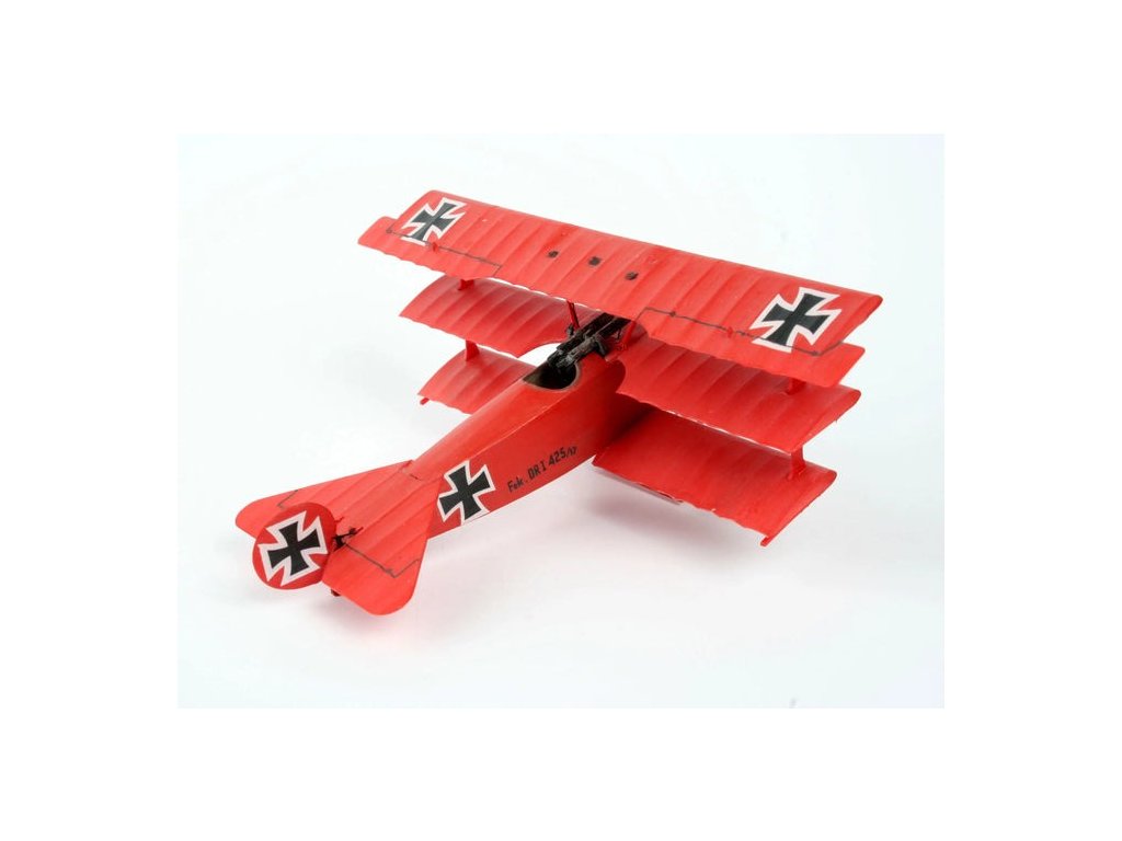 Plastikmodellbausatz eines deutschen Jagdflugzeugs aus dem Ersten Weltkrieg, bekannt als „Roter Baron“. Der Bausatz enthält außerdem Grundfarben, Klebstoff und einen Pinsel.