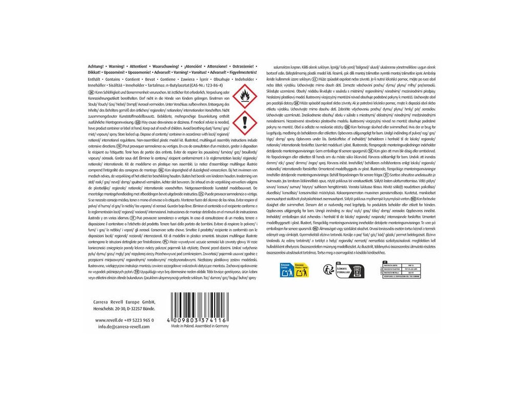 Kunststoffbausatz, enthält unmontierte und unlackierte Teile. Bei einigen Bausätzen sind zusätzlich Metall-, PUR- und Gummiteile enthalten. Achtung, enthält Kleinteile, außerhalb der Reichweite von Kindern unter 3 Jahren aufbewahren. Nicht geeignet für Kinder unter 14 Jahren.