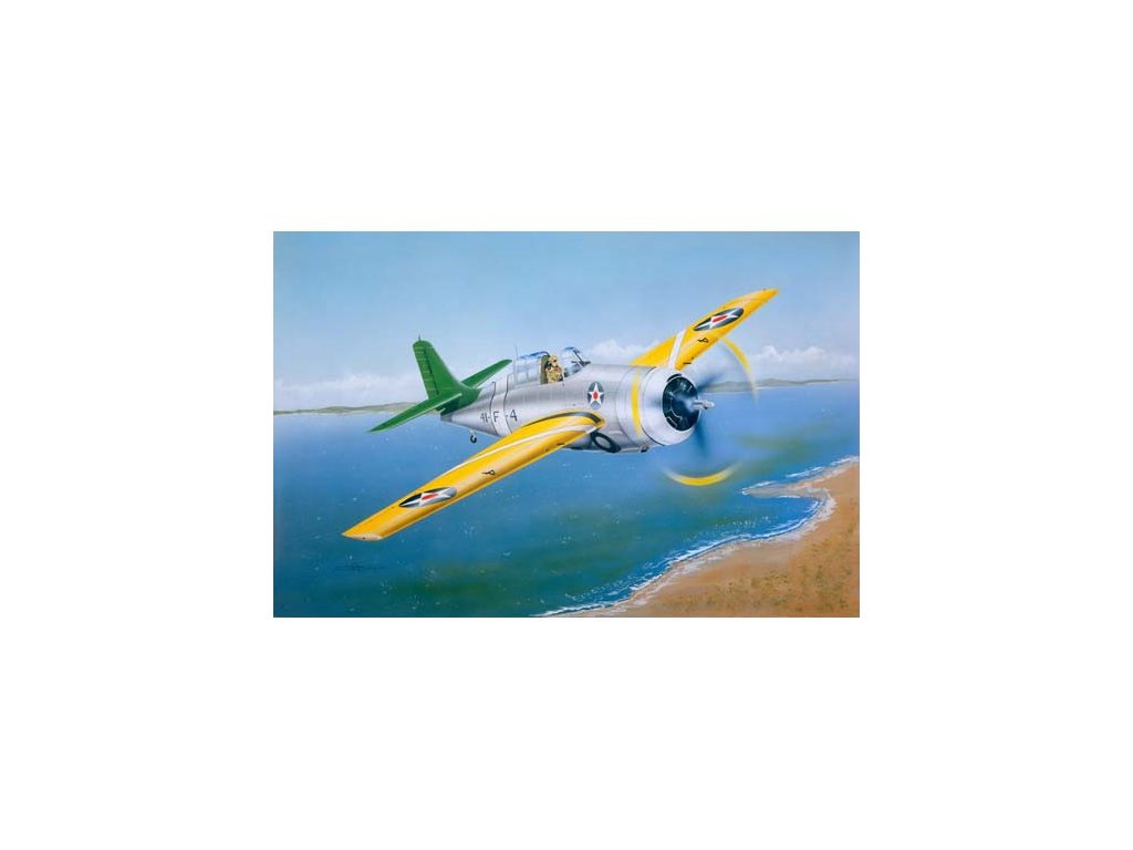Plastikmodellbausatz eines amerikanischen Marine-Kampfflugzeugs aus der Zeit des 2. Weltkriegs. Der Bausatz enthält außerdem fotogeätzte Metallteile und Gummireifen.