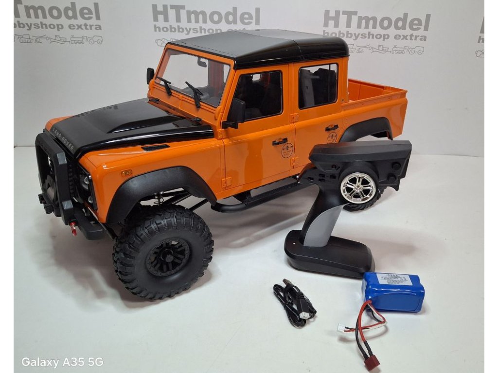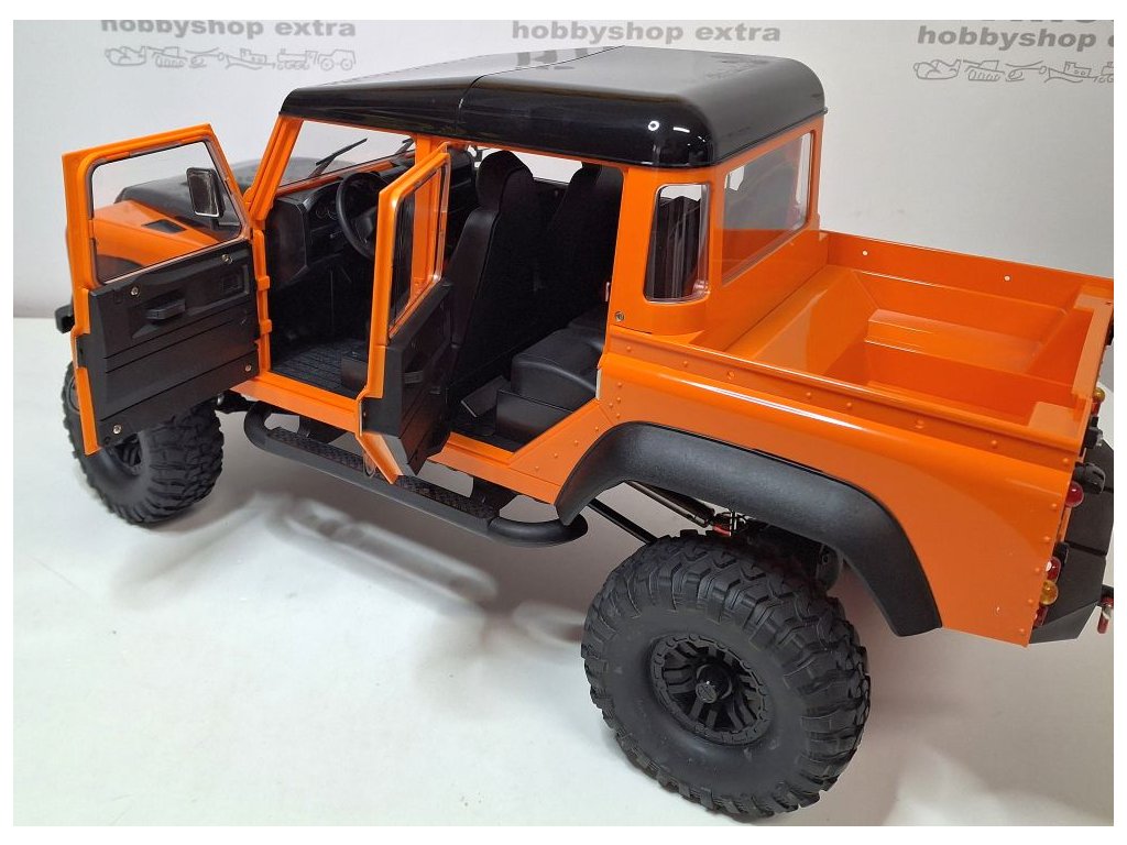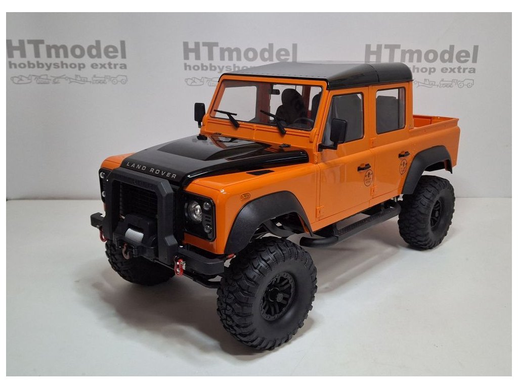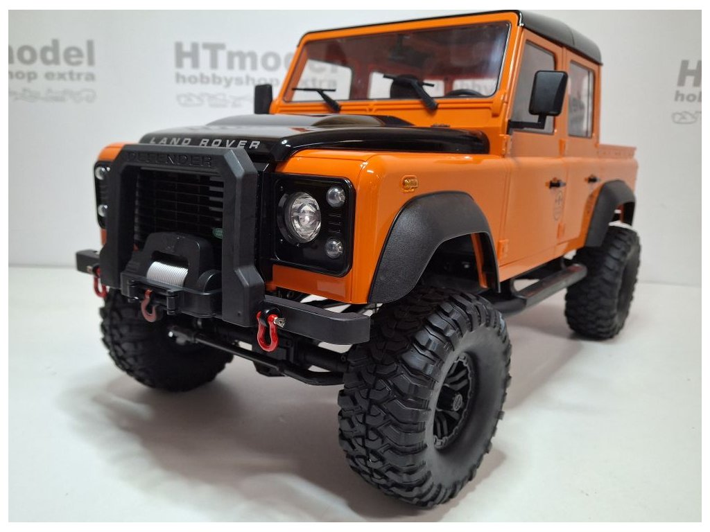 Ferngesteuertes Modell mit lizenzierter Land Rover Defender Karosserie im Maßstab 1:8 in Metall-Kunststoff-Konstruktion. Die detailreiche Karosserie besteht aus ABS-Kunststoff und verfügt über zu öffnende Türen, eine Motorhaube und einen fein gestalteten Innenraum.