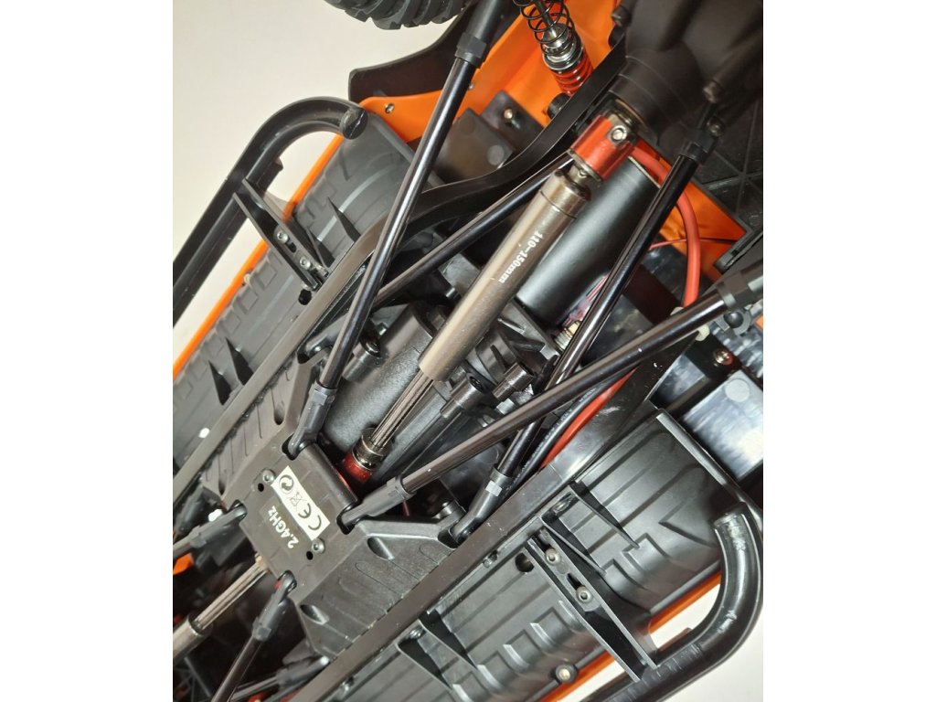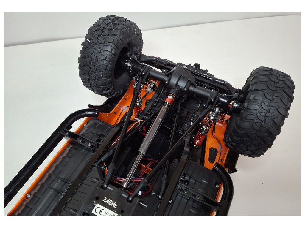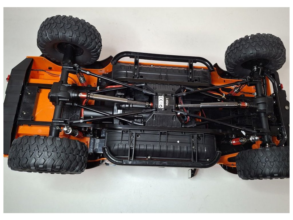 Das Fahrzeug verfügt über ein Chassis mit Metallrahmen, CVD-Antriebswellen, Differenzialsperren, einem 550-cm³-Gleichstrommotor (Bürstenmotor) und einer digitalen Servolenkung mit 21 kg Drehmoment. Das Auto wird mit einer 3-Kanal-Fernsteuerung gesteuert. Mit der Fernsteuerung können Sie Gas und Lenkung einstellen, vorwärts/rückwärts und links/rechts fahren sowie die Gänge (hoch/niedrig) wählen.