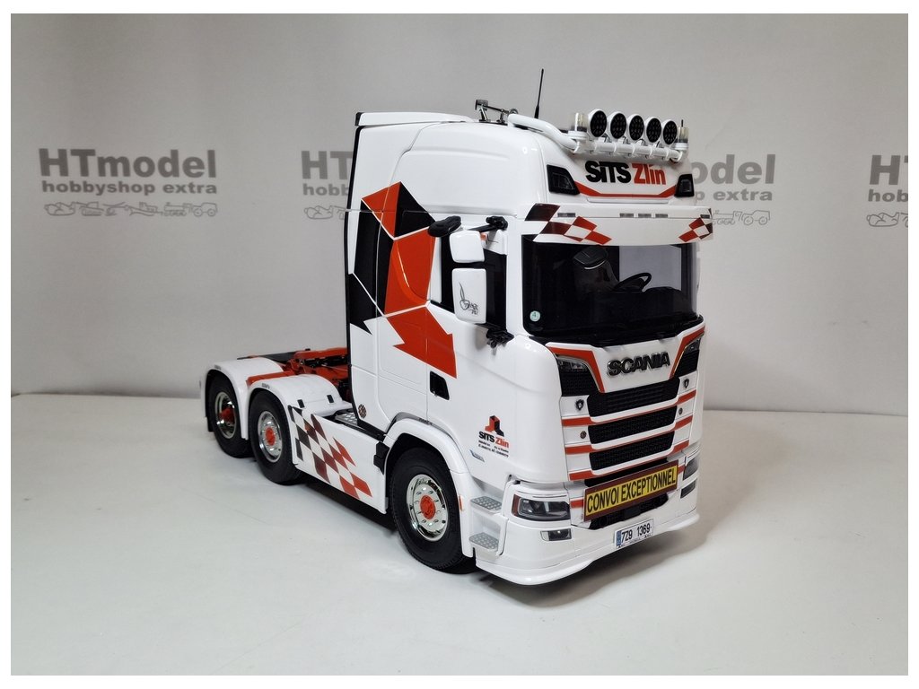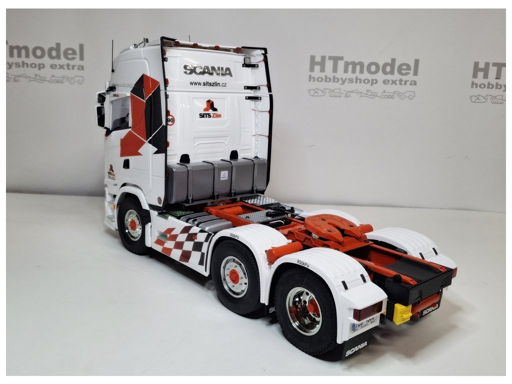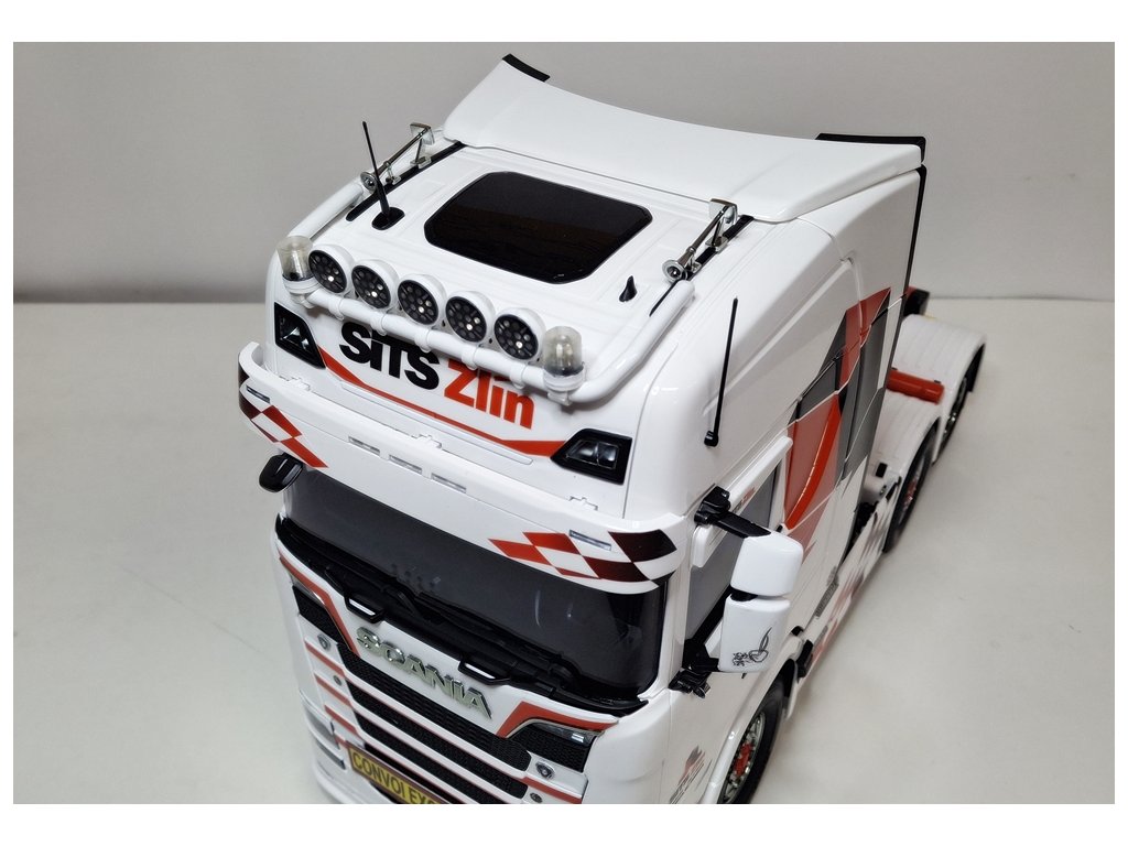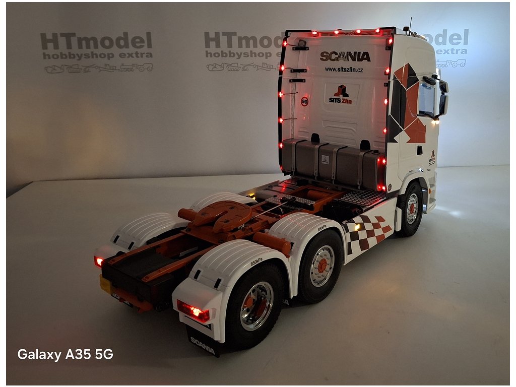 Der Kunde wünschte sich ein möglichst originalgetreues Modell. Daher verfügt das aus dem Tamiya-Bausatz gefertigte Modell über zahlreiche 3D-gedruckte Zubehörteile. Sound und Licht werden über die Tamiya MFC-03 Multifunktionseinheit und die Carson 14-Kanal-Fernsteuerung gesteuert. Die Rundumleuchten stammen von Š-hobby und wurden mit neuen Abdeckungen versehen. An der Rückwand des Fahrerhauses befinden sich Arbeitsscheinwerfer, die über den Dsys-Fernschalter gesteuert werden. Die Carson-Mittelachse ist gelenkt und mit einem selbstsperrenden Differenzial ausgestattet. Die Ansteuerung erfolgt über das Carson CS-3 Servo.