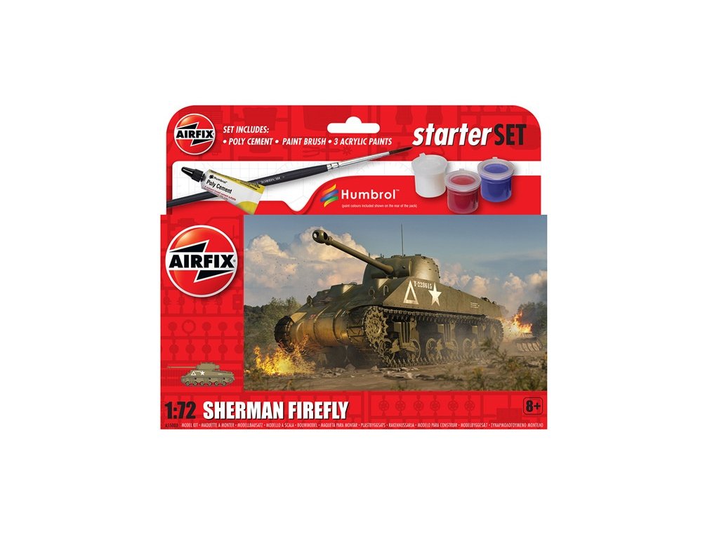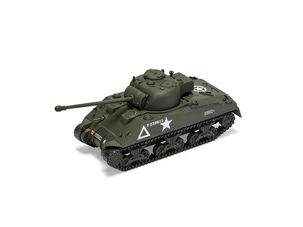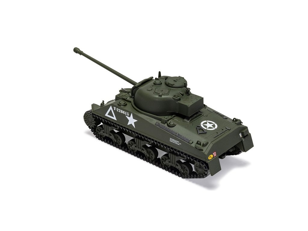 Einsteiger-Bausatz eines Kunststoffmodells eines amerikanischen Panzers aus dem Zweiten Weltkrieg, inklusive Grundfarben, Kleber und Pinsel.