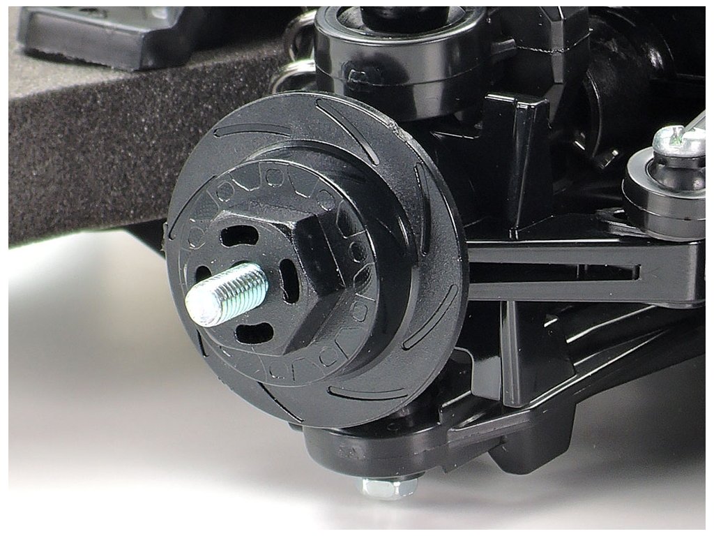 Tamiya TT-02-Chassis. Der 4x4-Antrieb erfolgt über einen zentralen Kardan, der die Differentiale der Vorder- und Hinterachse verbindet. Durch die Platzierung der Batterie in der Längsachse neben dem zentralen Kardan wird eine hervorragende Stabilität gewährleistet. Der Motor befindet sich vor der Hinterachse, was die Fahreigenschaften weiter verbessert.