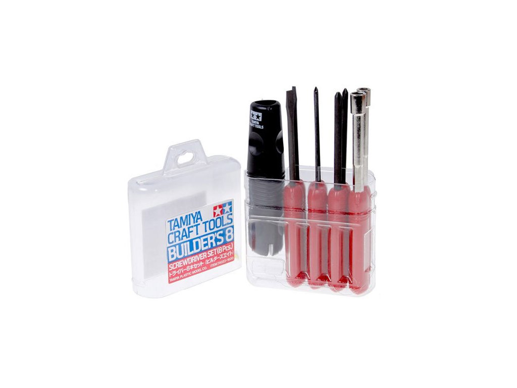Tamiya Schraubendreher-Set mit Griff, bestehend aus 8 Schraubendrehern verschiedener Typen und Größen. Enthält drei Kreuzschlitzschraubendreher, zwei Schlitzschraubendreher, zwei Steckschlüssel und einen Innensechskantschlüssel. Verpackt in einem praktischen Kunststoffkoffer.