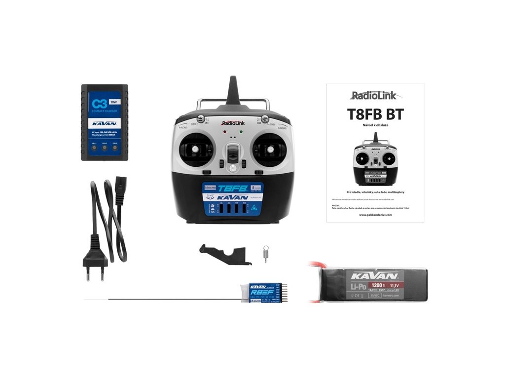 Das Modell wird von einem Achtkanal-KAVAN/Radiolink-2,4-GHz-FHSS-Sender (Frequency Hopping Spread Spectrum System) mit Kreuzsteuerungen im Modus 1 (Gashebel rechts) gesteuert. Sie können ihn „direkt nach dem Auspacken“ als klassischen „Nicht-Computer“-Sender mit Trimmungen und mechanischen Giersensorschaltern für die Kanäle Querruder, Höhenruder, Gas und Seitenruder verwenden. Nach der Verbindung mit einem PC oder einer Anwendung für Smartphones mit dem Betriebssystem Android oder iOS haben Sie dann die Möglichkeit, die Größen und Richtungen der Auslenkungen programmgesteuert einzustellen, Doppelauslenkungen, exponentielle Auslenkungsprogression und andere intelligente Funktionen zu nutzen. Um den Sender mit Strom zu versorgen, benötigen Sie 4 AA-Alkalibatterien (Bleistift) oder Akkus, einen 2-3S LiPo-, Li-Ion- oder LiFe-Akku (diese sind nicht Teil des RC-Sets).