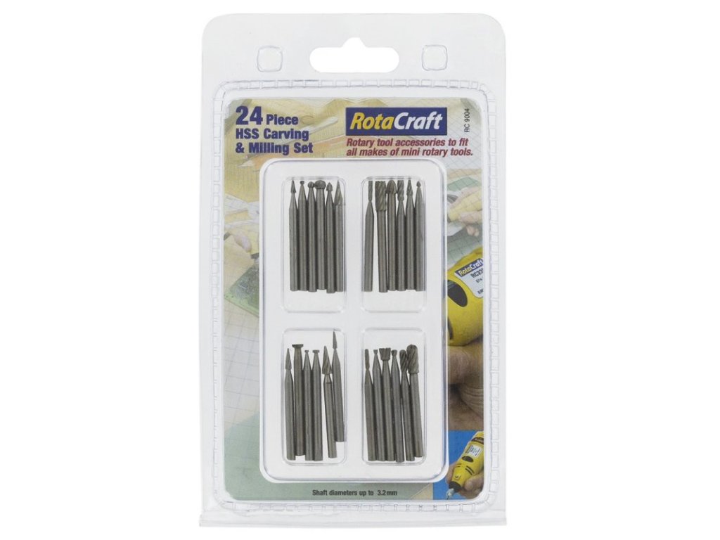 Set of power tool cutters of various shapes (round, conical and cylindrical). Suitable for milling and carving in plastic, fiberglass, lexan, wood or soft metals.