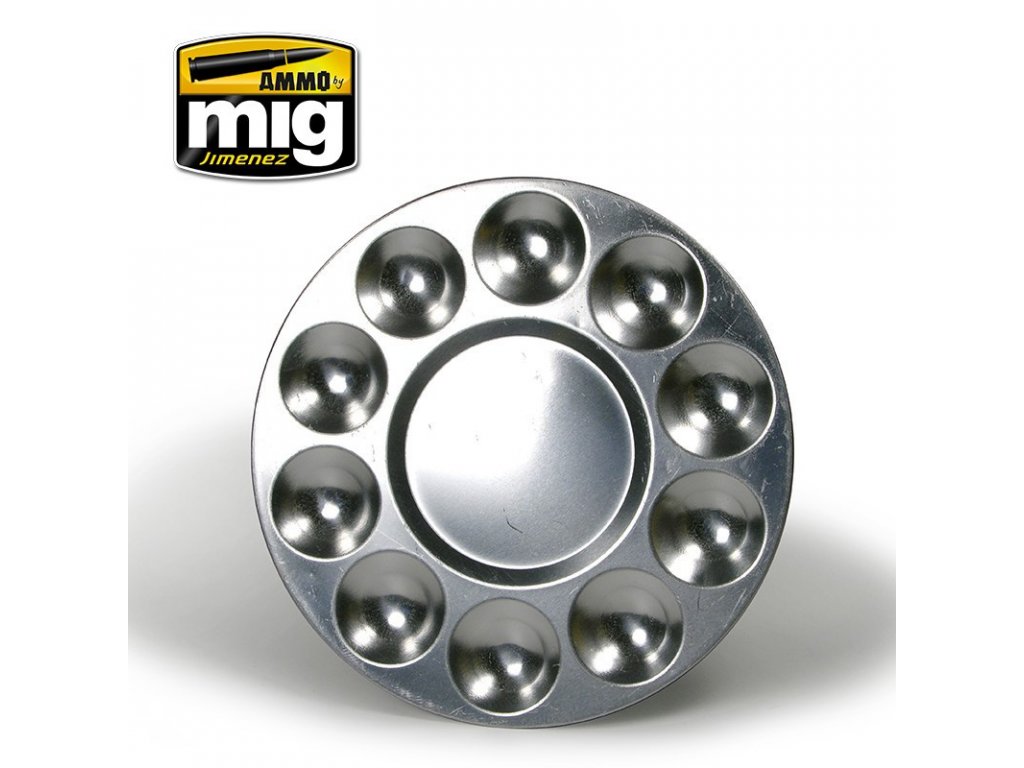 Aluminum palette for mixing paints with 10 wells. It is resistant to all types of paints and modeling chemicals.