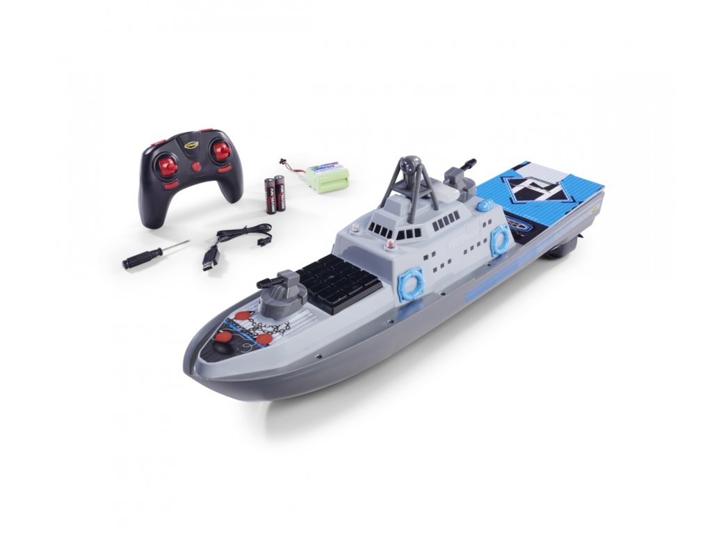 Package contents: Fully assembled ship model, 2.4GHz remote control, NiMH 7.2V/1000mAh drive battery, USB charger, 2x AA transmitter batteries, user manual.