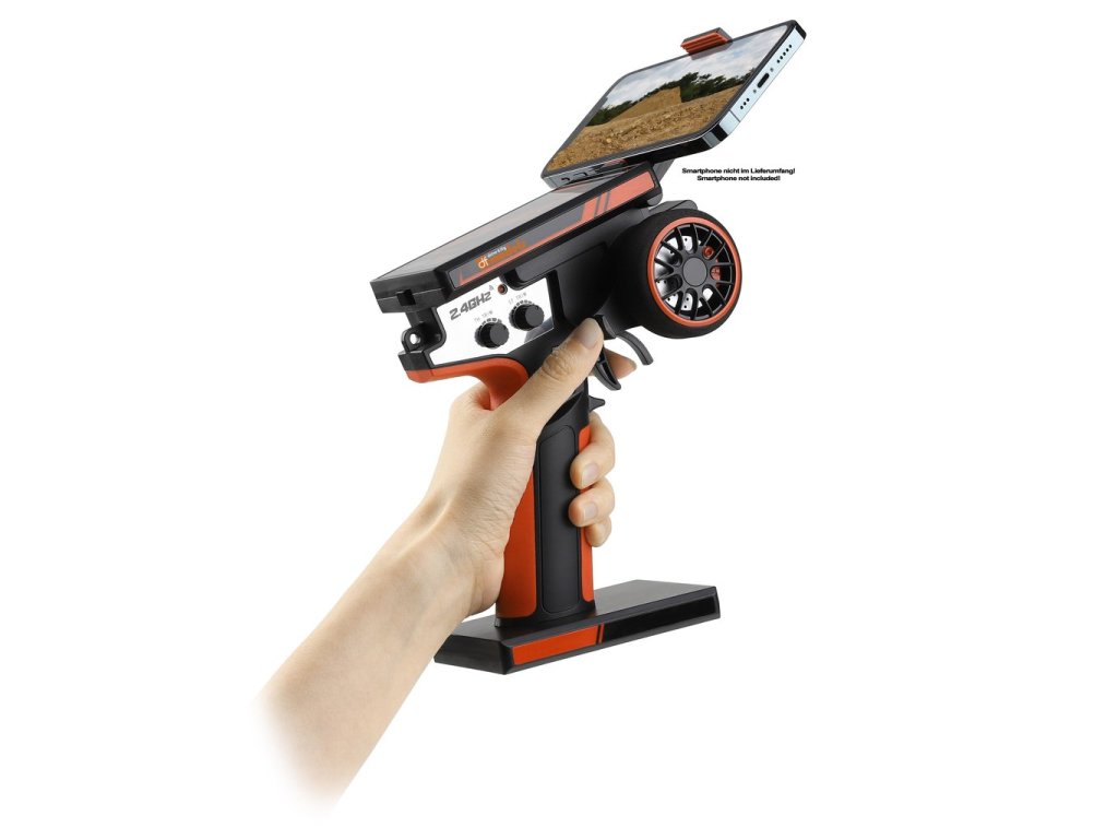 Another highlight is the integrated cell phone holder. You can attach your smartphone to the remote control and therefore have the option of shooting action videos yourself, for example; no 3rd hand or 2nd person required for filming, you can concentrate fully on controlling your model.
