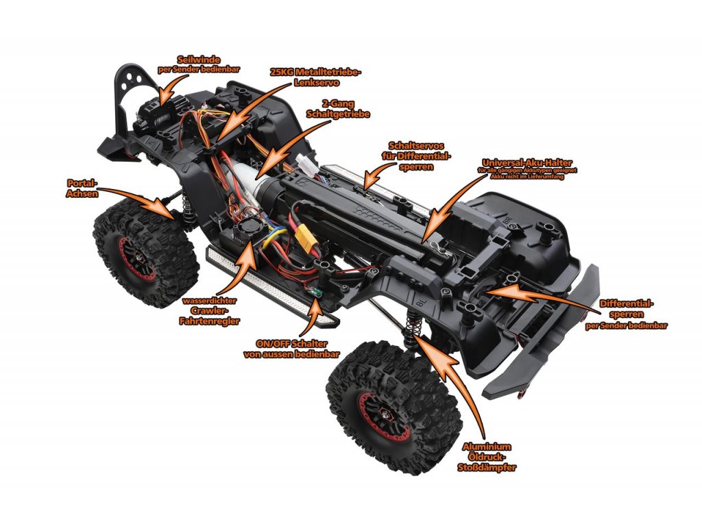 Features: LED lighting, winch, 2-speed gearbox, diffs lockable / unlockable by transmitter