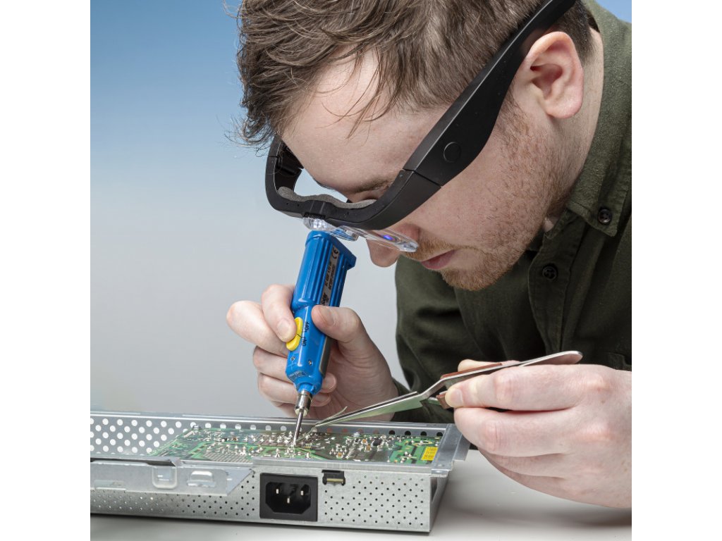 Fixed frame glasses with magnifying glass and LED spotlight, ideal for professional restoration, electronic modeling and engineering work. Comfortable glasses frame with non-slip arms and powerful interchangeable single-lens magnifiers with magnification from 1.5x to 5.0x.
