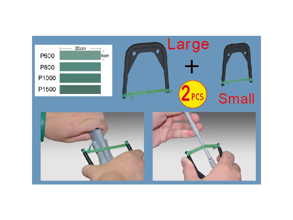 Practical frame holders designed for sandpaper strips. Simply stretch the sandpaper strip of the desired grit between the arms and then comfortably and very gently sand the surface of the model or other object.