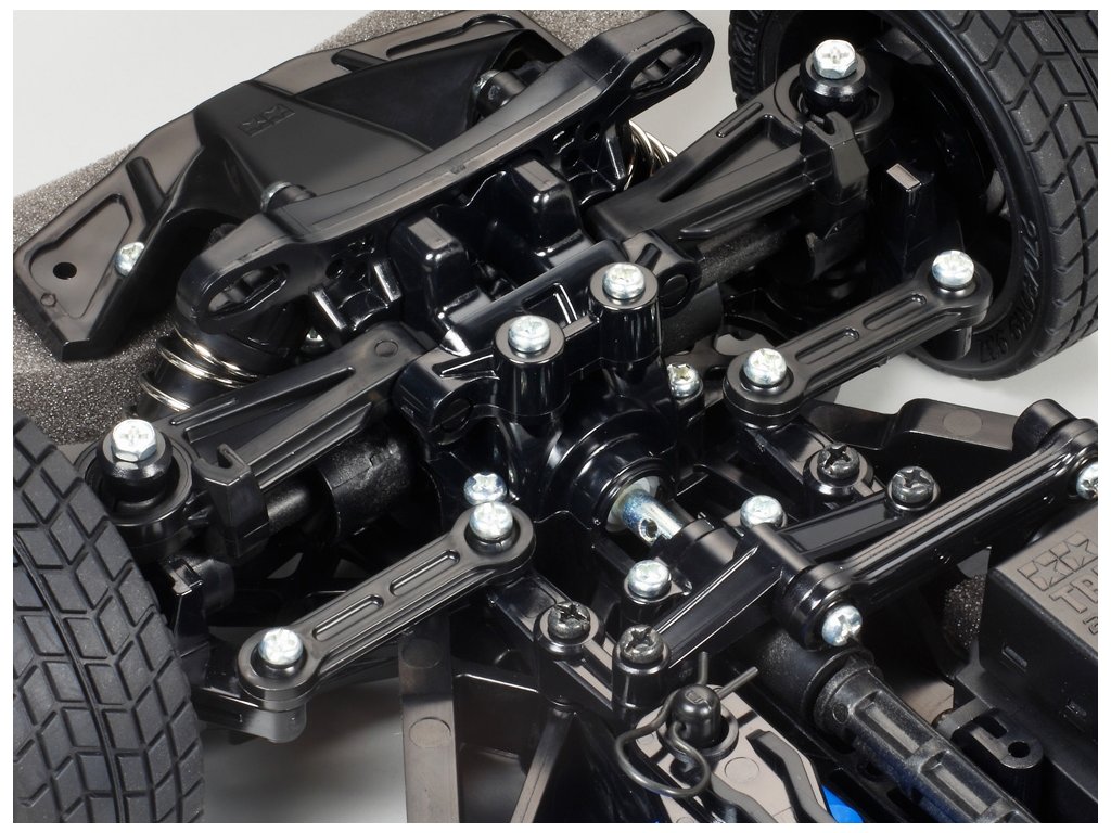 Tamiya TT-02 chassis. 4x4 drive is provided by a central cardan connecting the differentials of the front and rear axles. Excellent stability is ensured by placing the battery in the longitudinal axis next to the central cardan. The engine is located in front of the rear axle, which further improves the driving characteristics.