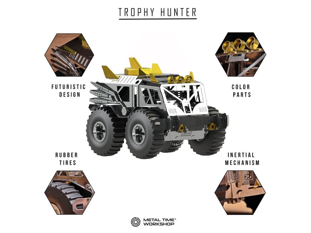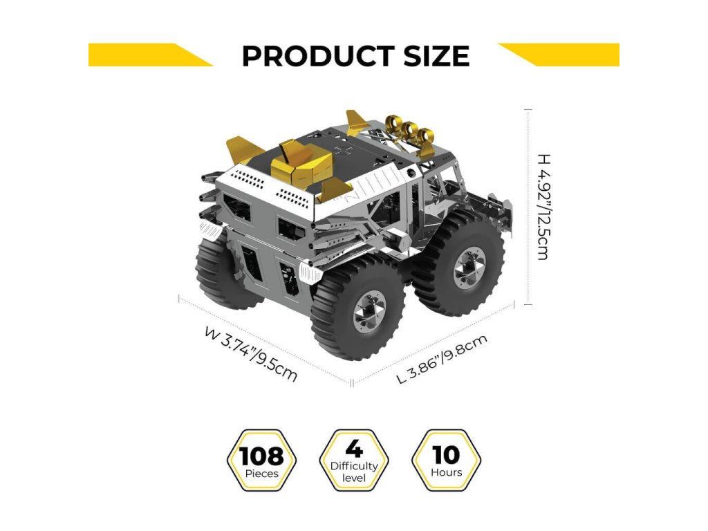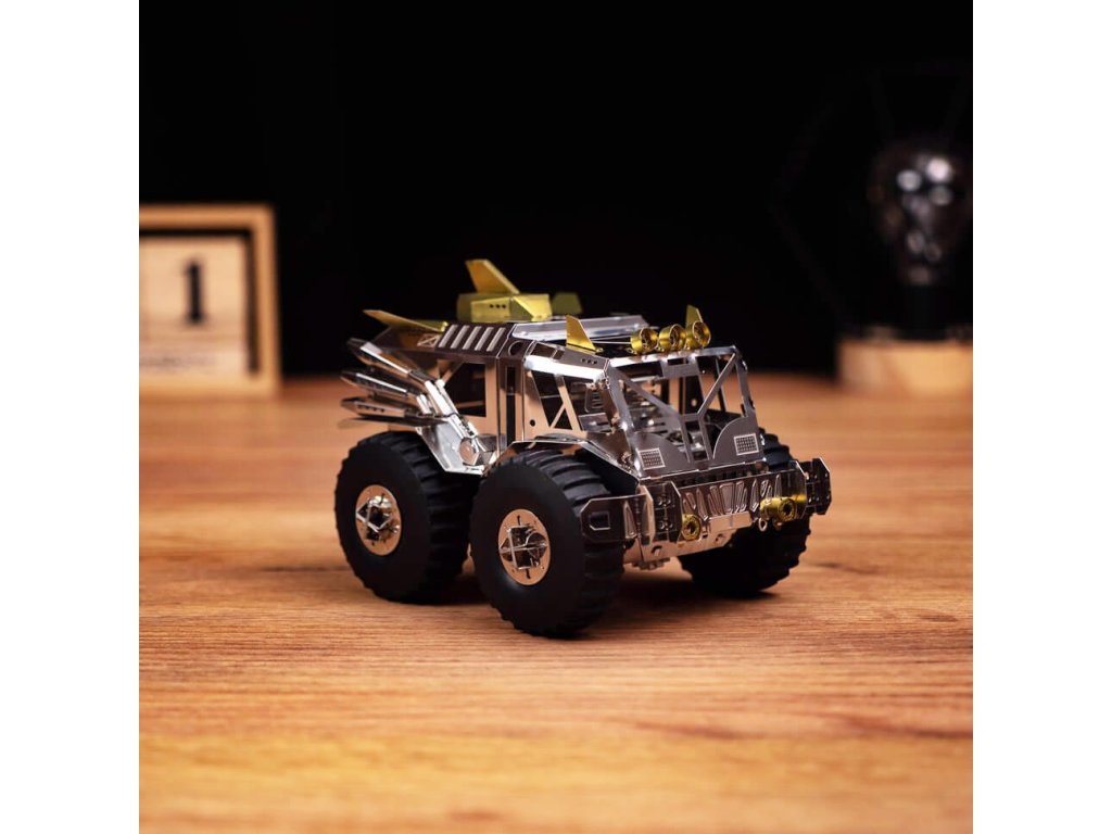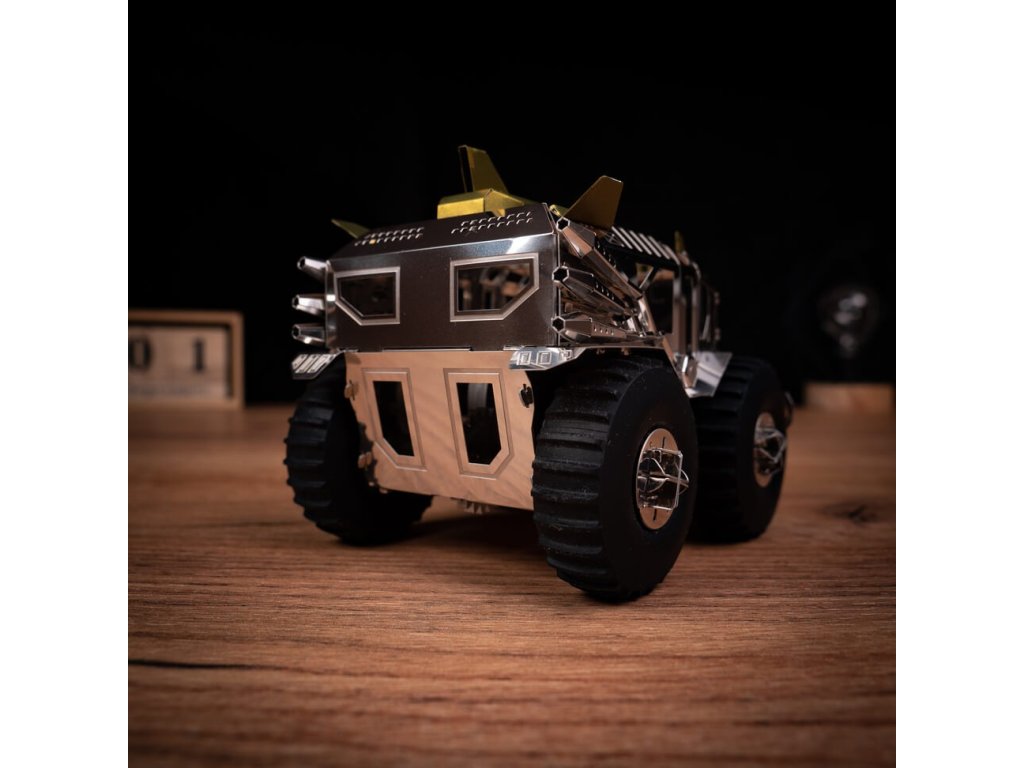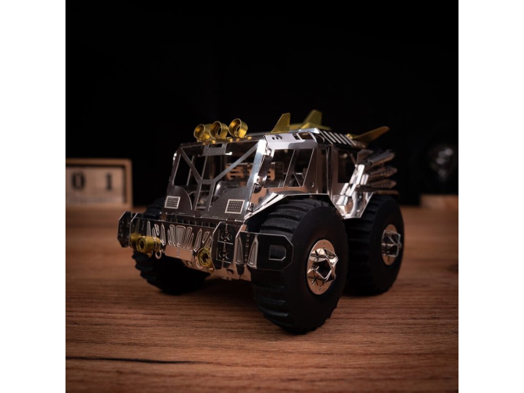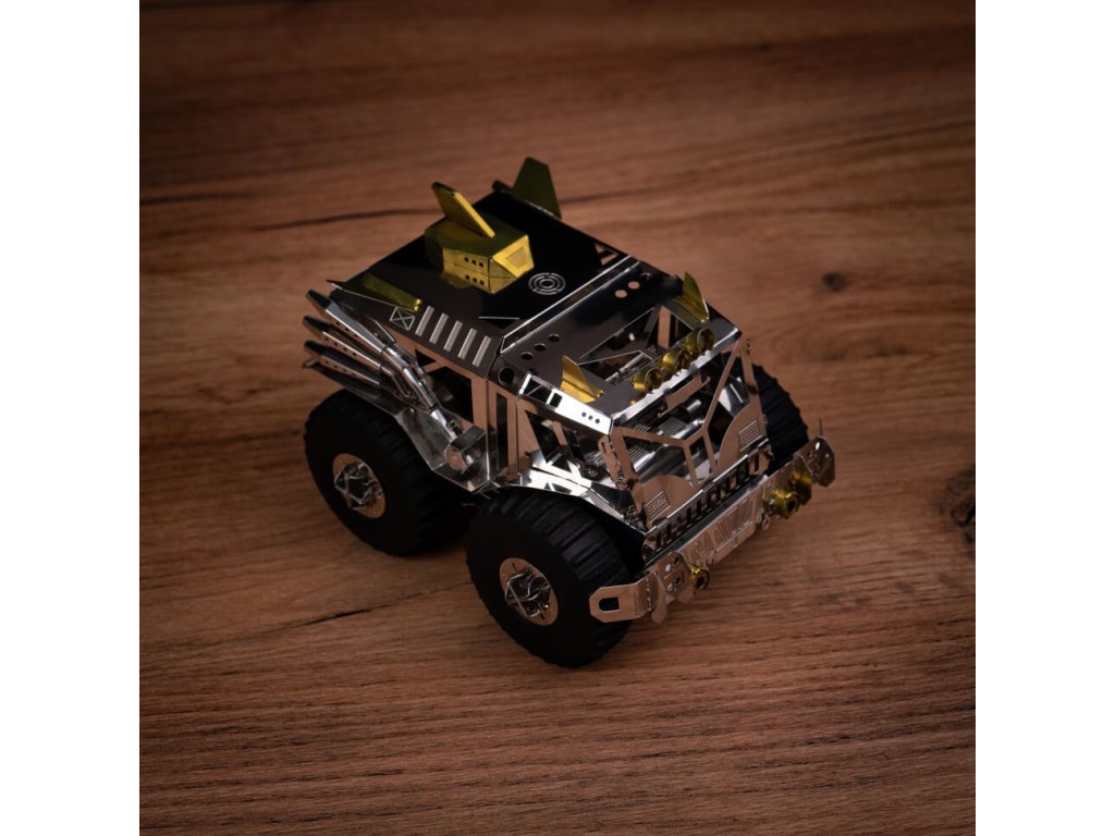 Metallic model kit. Made of high-quality polished steel sheet by laser burning and precise machining. Suitable for moderately advanced and older children. The kit includes nippers, a file, gloves, a cleaning cloth and collectibles such as a badge and stickers.