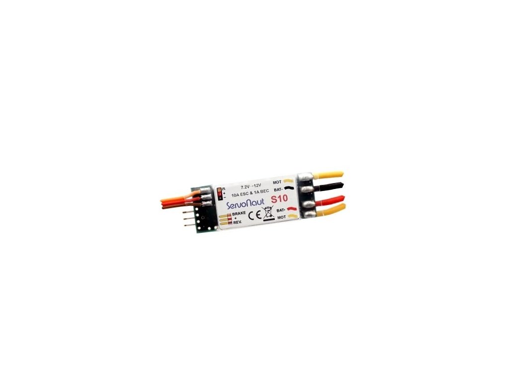 Regulátor Servonaut S10 je malý obojsmerný regulátor pre elektromotory do 10A. Podpäťová ochrana (LiPo-Saver) sa nastavuje automaticky na 7,2V (LiPo 7,4V) alebo 12V (LiPo 11,1V).