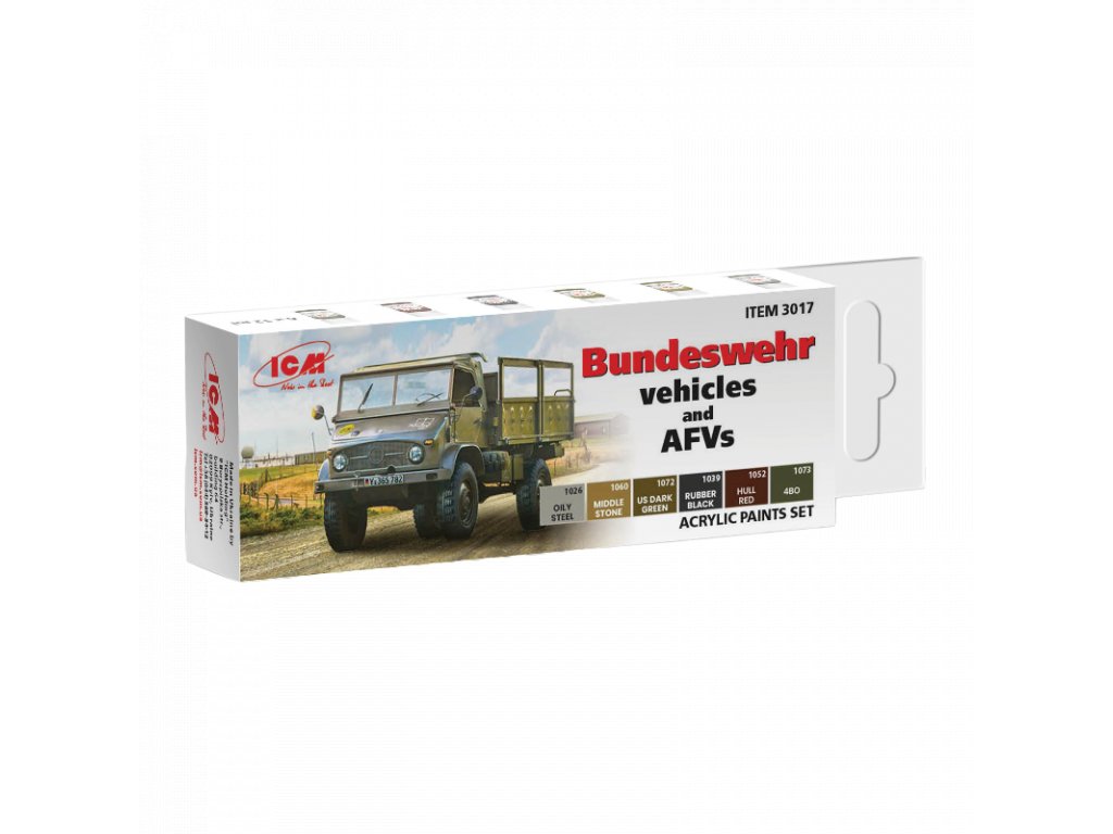 Sada 6 modelárskych akrylových farieb značky ICM určená pre nafarbenie alebo nastriekanie modelov nemeckých vojenských vozidiel.