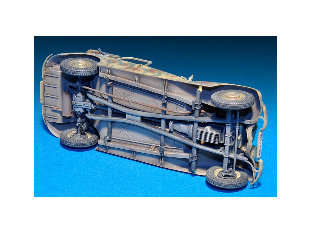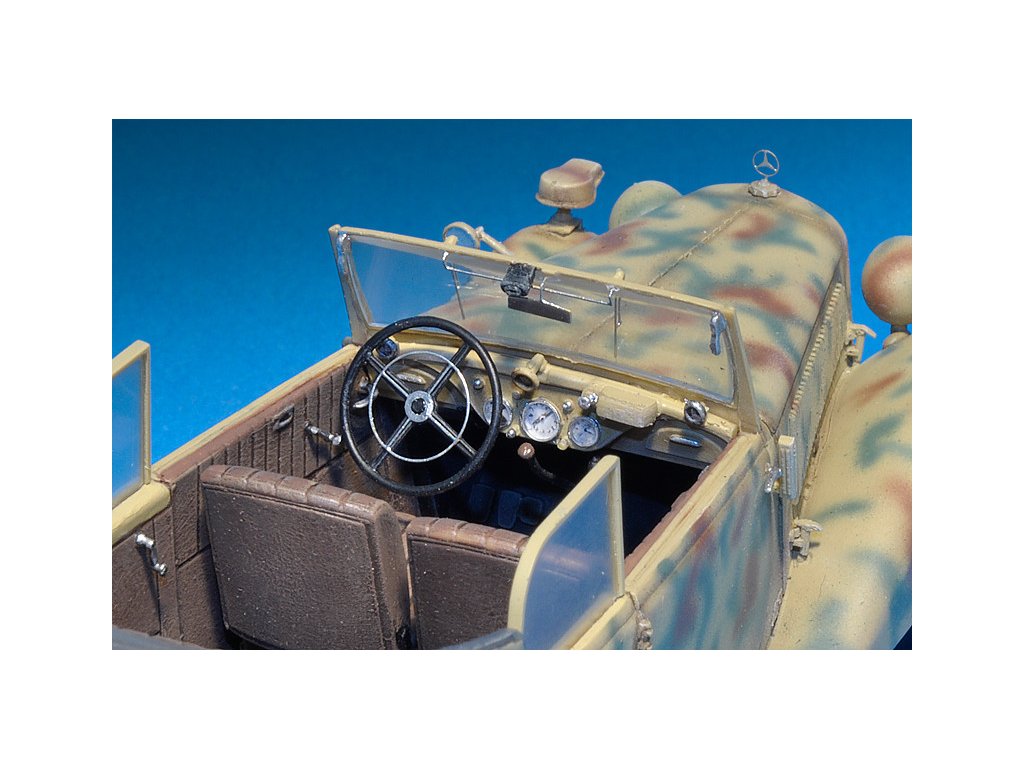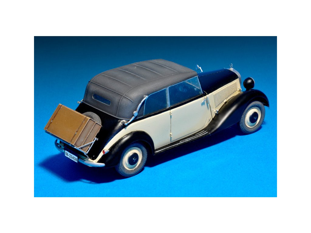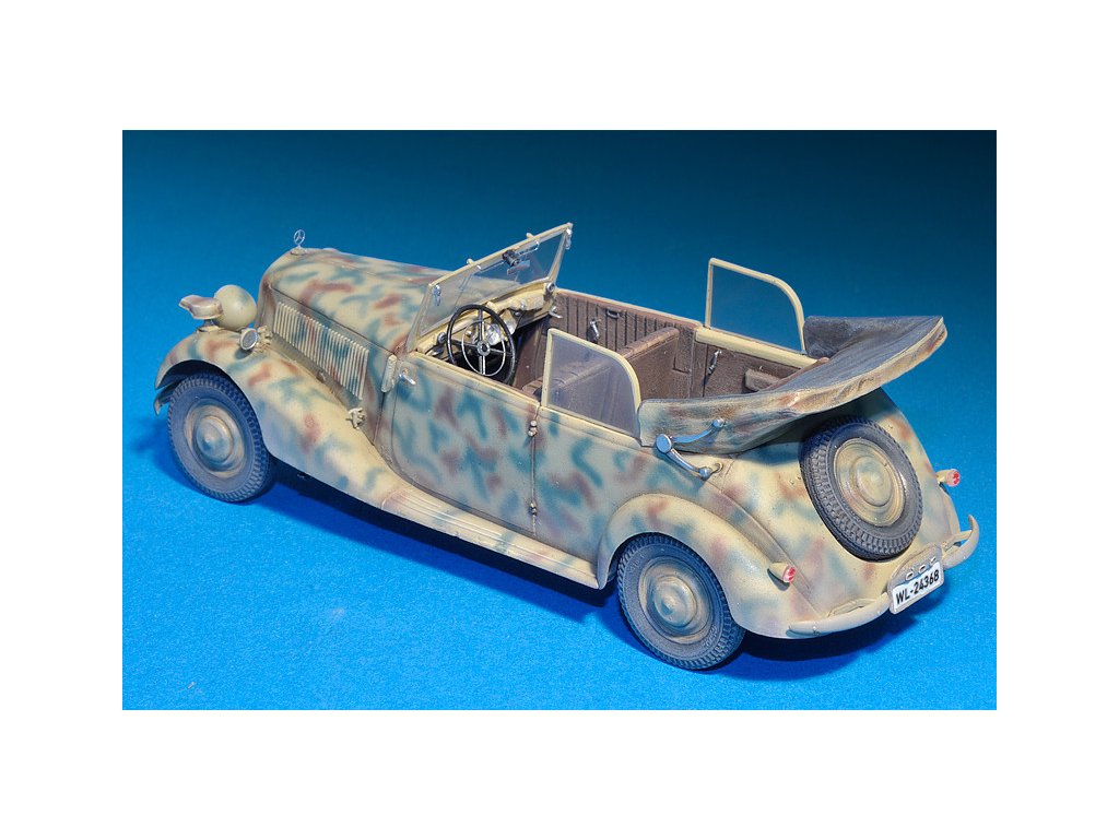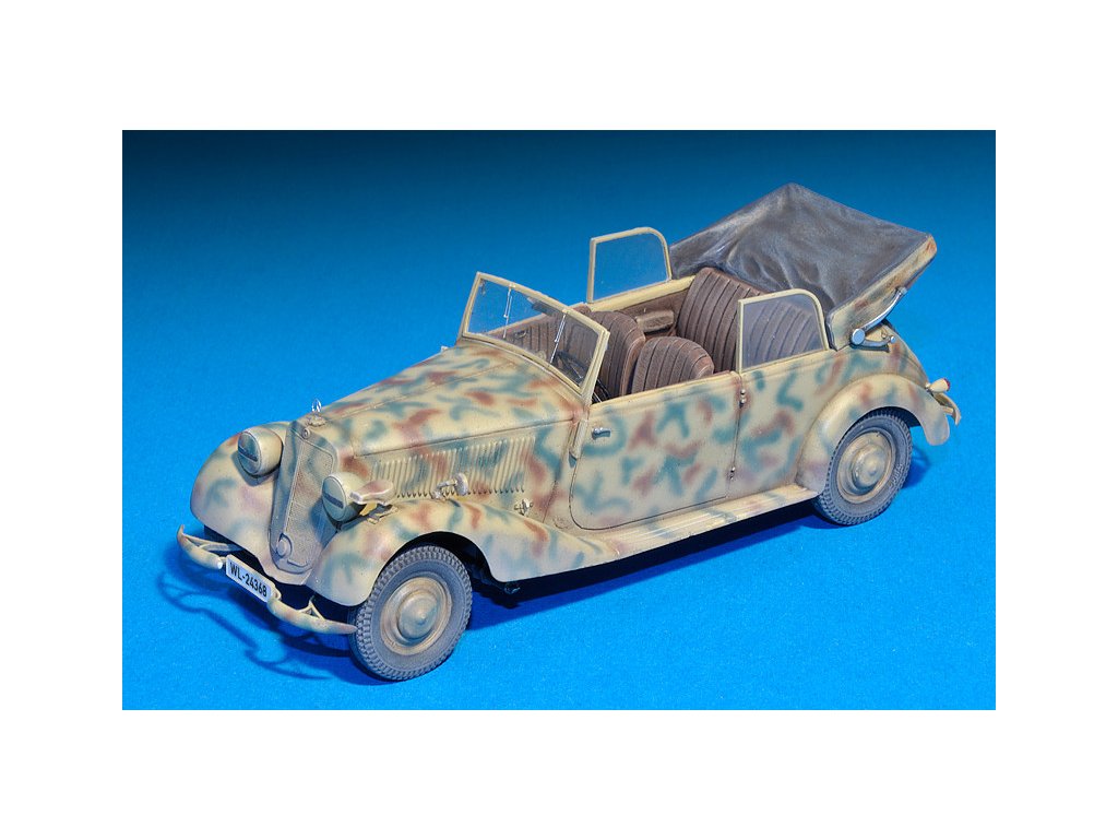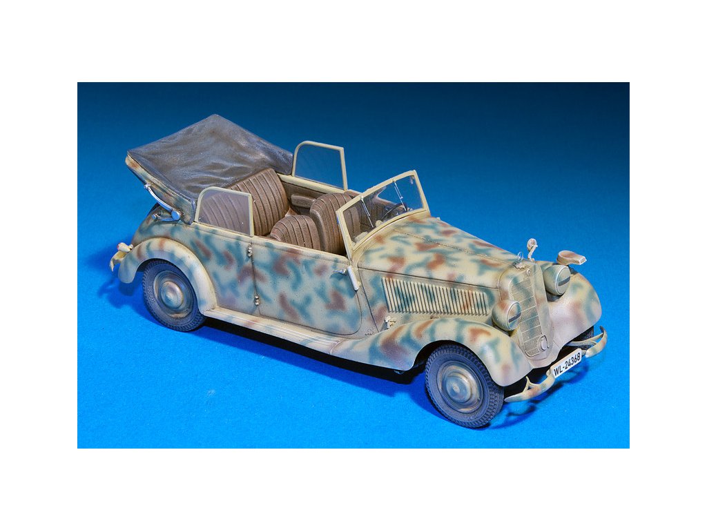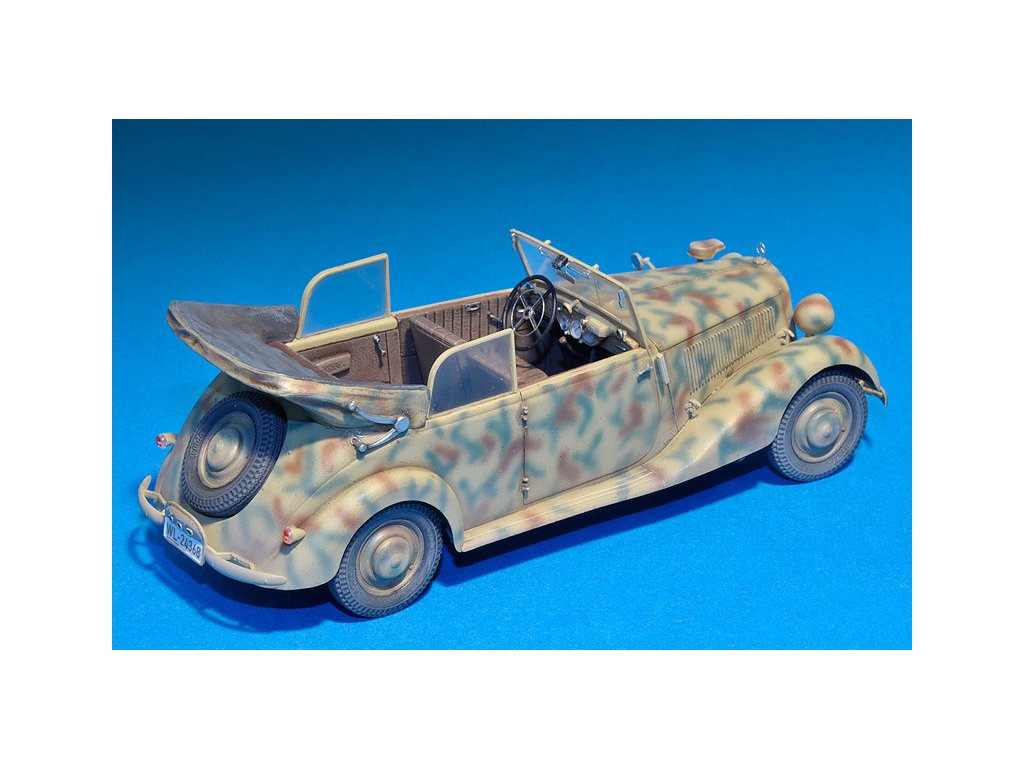 Stavebnica plastového modelu nemeckého štábneho auta z obdobia 2. svetovej vojny.