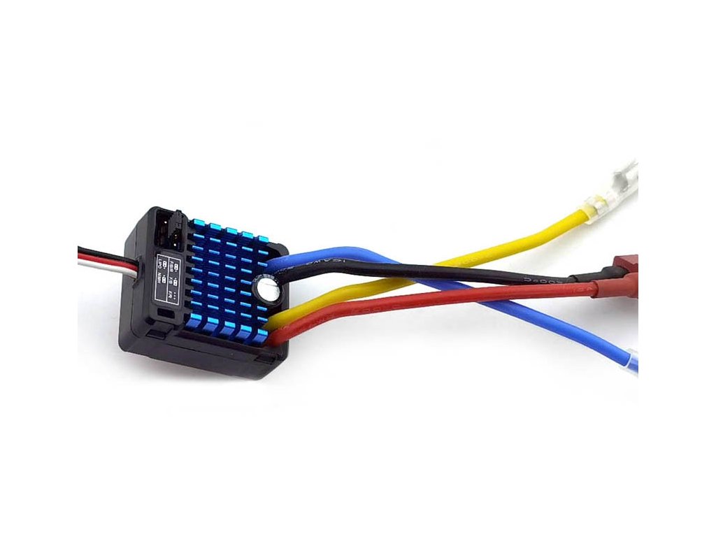 - Jednosmerný motor RC550, 60A regulátor a 15 kg servo.