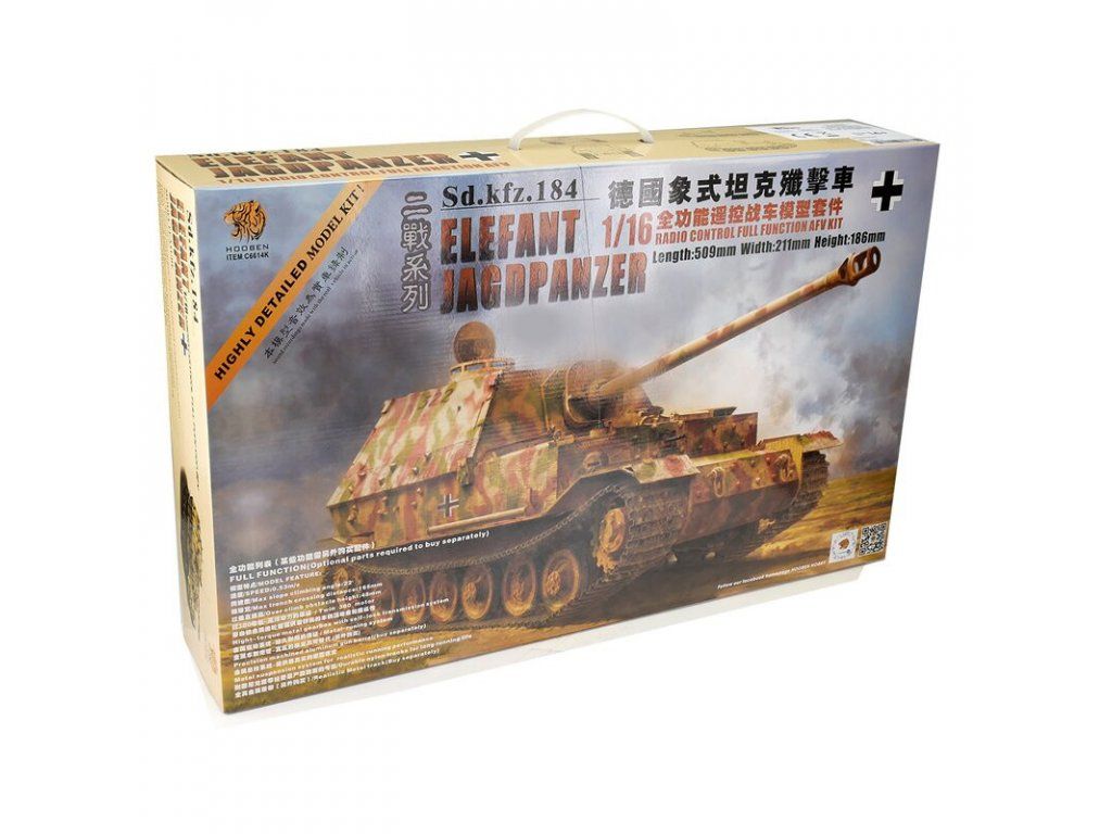 Náš test Elephant: Tento vydarený model som staval už dvakrát. Prvý raz som si ho postavil pre vlastné potešenie (používam ho už niekoľko rokov) a druhý som staval pre zákazníka. Stavebnica je veľmi kvalitná, aj keď má niektoré drobné nedokonalosti, ktoré sa ale vzhľadom na atraktívny výsledok ľahko odpúšťajú. Všetky plastové diely sú skoro bezchybne vylisované, kovové časti a spojovací materiál sú prehľadne usporiadané. Stavebný návod je vcelku a prehľadný a ak sa nebudete pri stavbe ponáhľať, zvládnete stavbu bez väčších problémov. Len si treba trochu potrápiť hlavu pri zostavovaní mechanizmov ovládania pohybu kanóna a záklzu, ktoré čínsky konštruktér "modernizoval" počas výroby a tak je pôvodný návod v niektorých krokoch nepoužiteľný a je nahradený skicou priloženou na samostatnom hárku. Ten dodatok k návodu akoby kreslilo dieťa na čínskej základnej škole. Ale to skúsený modelár zvládne. Všetky diely k sebe pekne pasujú a netreba riešiť žiadne komplikácie. Stavba sa dá zvládnuť za pár večerov. Keďže v stavebnici nie je multifunkčná elektronika, modelár si môže vybrať, či postaví "tichý" model, alebo zainvestuje do niektorého typu multifunkčnej jednotky. Ja som zásadne za použitie MFU Elmod Fusion PRO. Raz som vyskúšal aj "originál" Hooben MFU, čo bola vlastne mutácia Clark TK-22, ale za tú cenu čo to stálo, to vôbec nestálo za nič. Jednoducho odporúčam Elmod, kto mi uverí, neoľutuje. Ďalej treba dokúpiť RC súpravu a baterku (prípadne nabíjačku). Ja mám k tomuto tanku svoj obľúbený RC set Carson Reflex Car/Boat (6 kanálový, jednoduchý) vysielač. Takže stačí len do prijímača nastrkať káble podľa návodu, skalibrovať systém a všetko krásne hneď funguje. Keďže Elmod má krásnu kolekciu zvukov, oplatí sa použiť kvalitný reproduktor. Ja som ho vo svojom modeli umiestnil aj do "debničky", aby bol zvuk pekne hlboký. Na môj Elephant som ešte doplnil pár drobných detailov ako sú oceľové laná a podobne, a na záver som ho mierne napatinoval. Jazdné vlastnosti zodpovedajú skutočnosti, je to pomalý model tak ako má byť. Na záver však môžem túto stavebnicu len odporúčať. Je to jednoducho zaujímavý produkt.