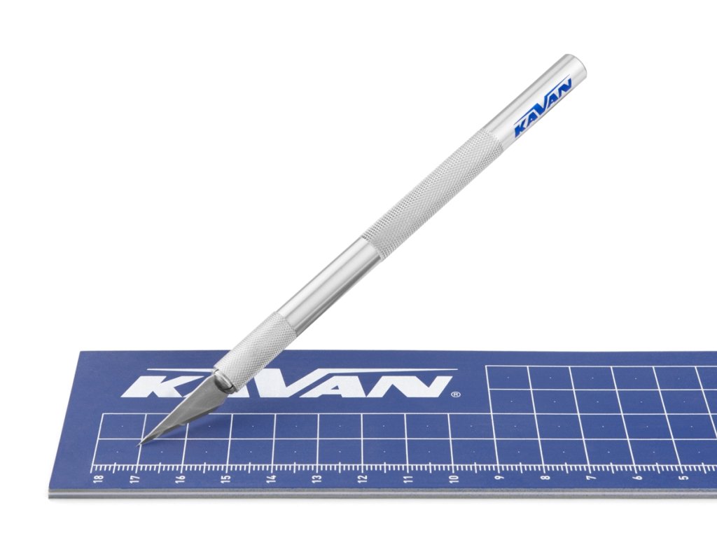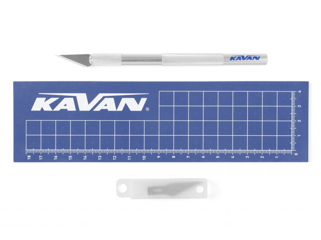 Kvalitný modelársky nôž KAVAN s reznou podložkou. Súčasťou balenia je sada náhradných čepelí.
