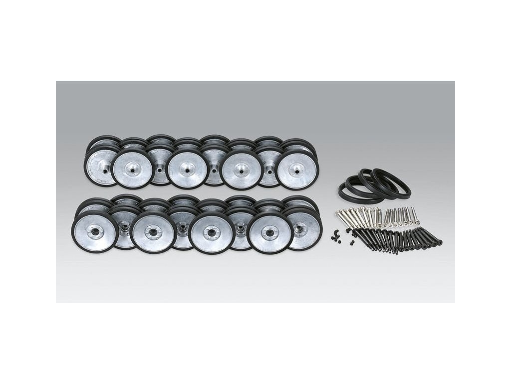 Sada kovových pojazdových kolies s gumenými obručami a oceľovými osami, určené pre tuning RC modelov Torro a Taigen Tiger I. s kovovou vaňou podvozku.